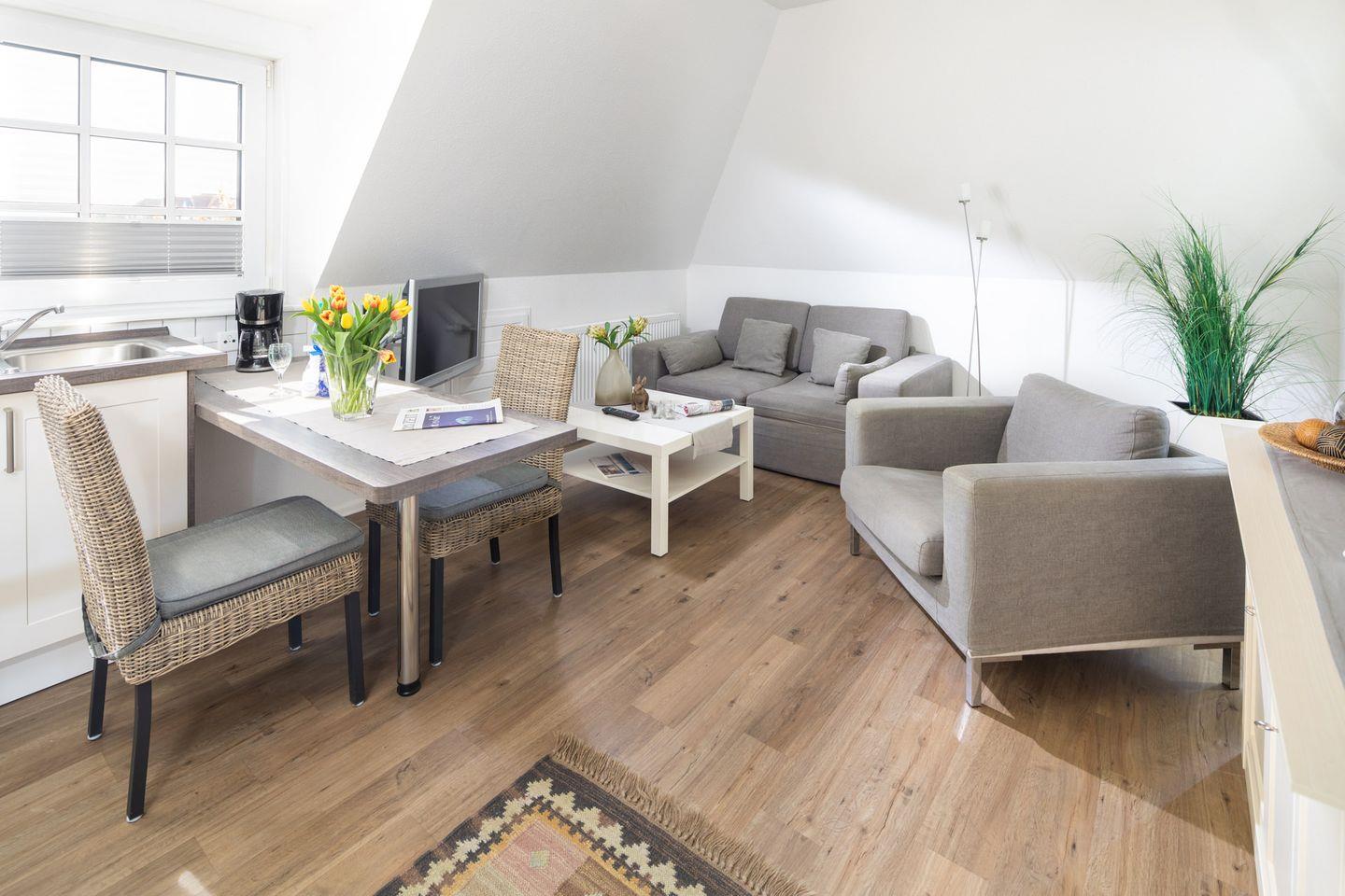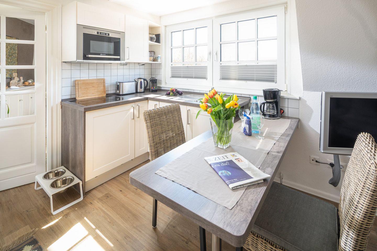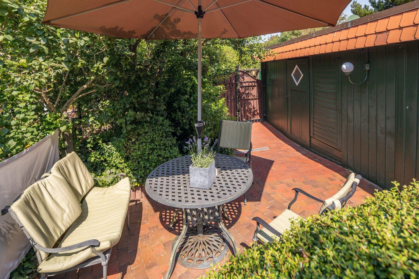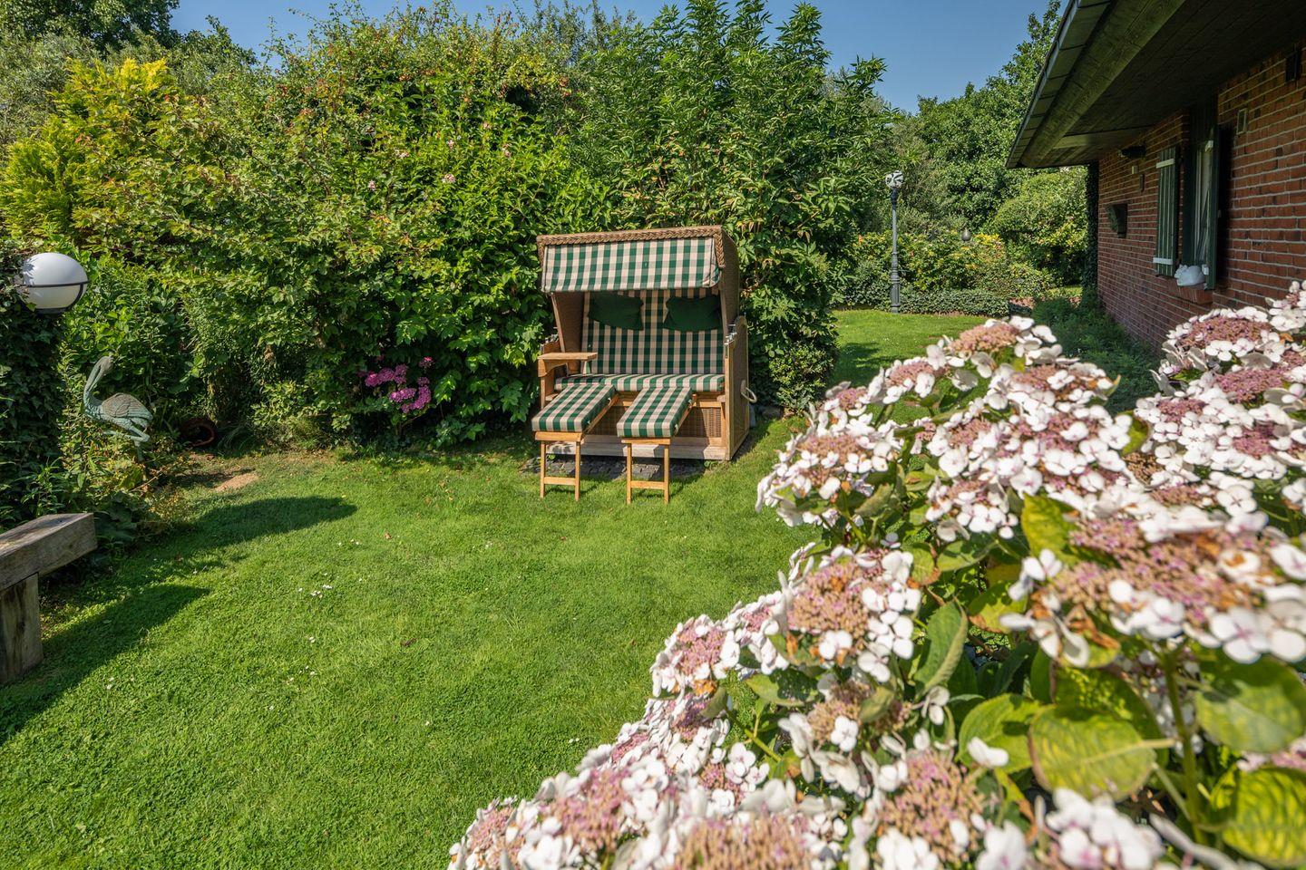 Obwohl das "Möwennest" keine eigene Terrasse hat, stehen gemütliche Sitzbereiche für die drei Wohnungen im Haus im Garten zur Verfügung. Hier können Sie die Sonne genießen, im Freien entspannen oder ein Buch lesen. Für Hundebesitzer ist die Wohnung ebenfalls perfekt, da Ihr vierbeiniger Freund herzlich willkommen ist.