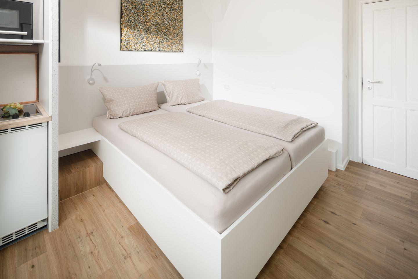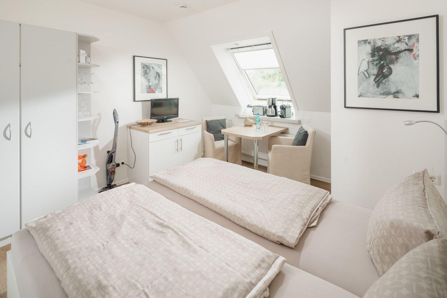 Die Einrichtung des Apartments ist liebevoll gestaltet und sorgt für eine behagliche Atmosphäre. Hier können Sie sich nach einem erlebnisreichen Tag an der Küste wunderbar entspannen und zur Ruhe kommen. Für einen traumhaften Schlaf sorgt das Doppelbett der Größe 180x200cm.