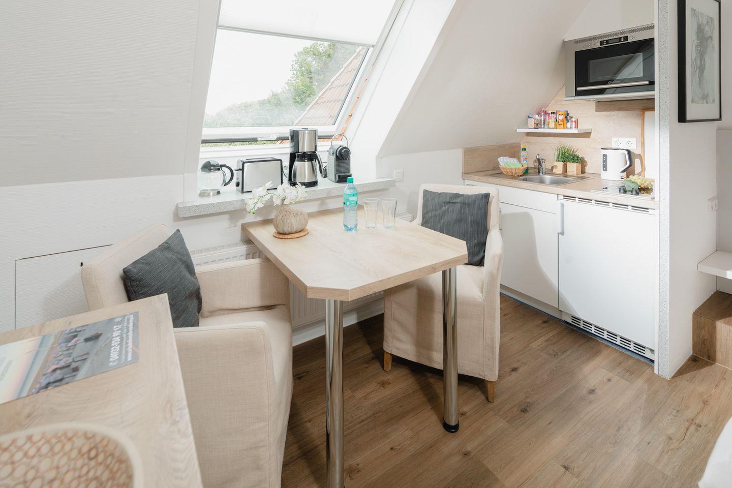 Die kleine Küche ist mit den nötigen Annehmlichkeiten ausgestattet, um einfache Mahlzeiten zuzubereiten. Sie finden alles, was Sie brauchen, um sich selbst zu versorgen und den Komfort einer eigenen Küche zu genießen.