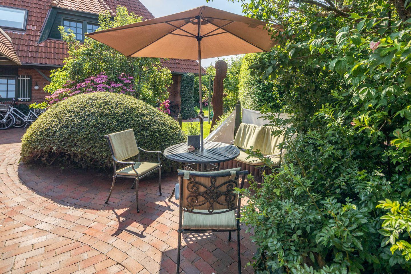 Im Gemeinschafts-Sitzbereich im Garten können Sie sich mit anderen Gästen austauschen oder einfach nur die frische Luft und die ruhige Umgebung genießen. Nutzen Sie diesen Ort, um Kontakte zu knüpfen oder Ihre Urlaubserlebnisse mit anderen zu teilen.