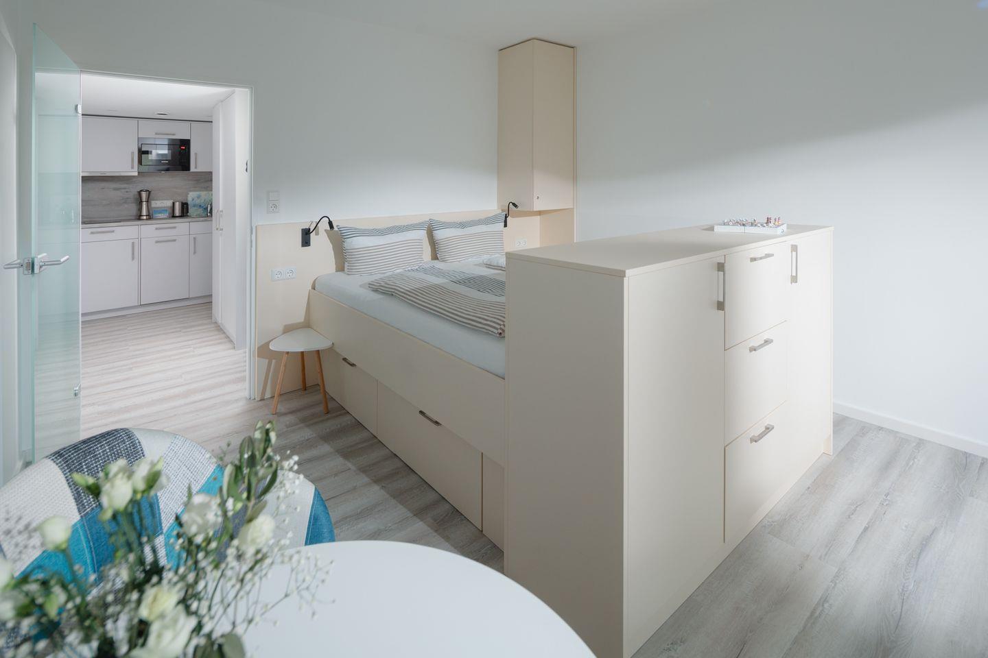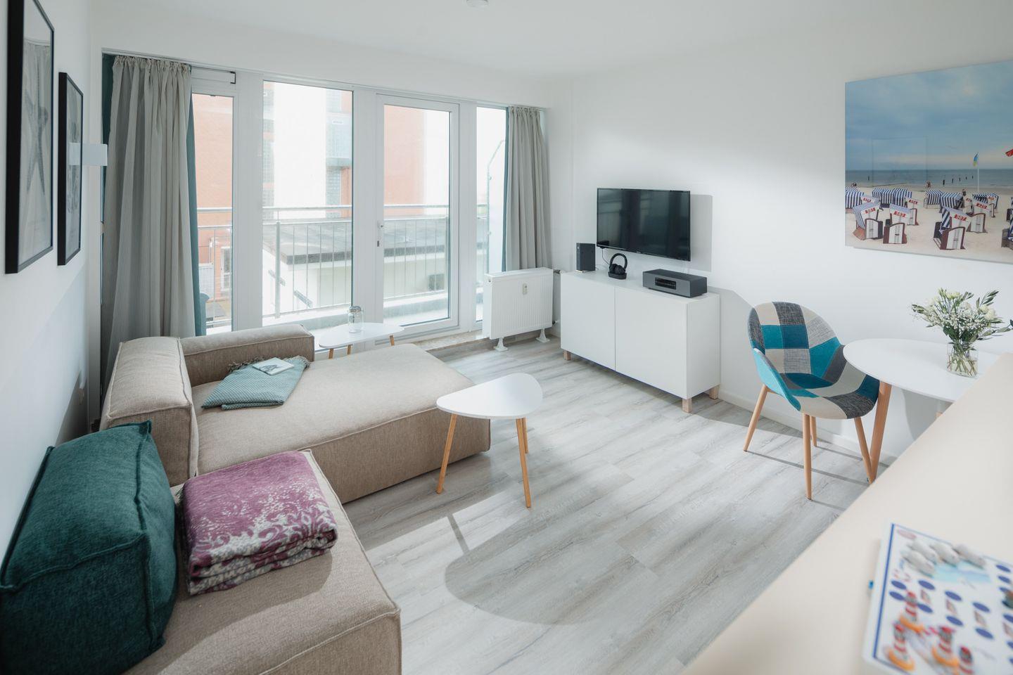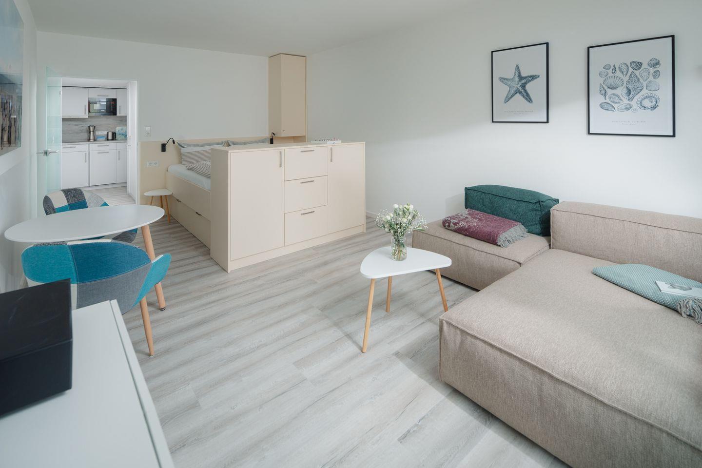Das Wohn-/Schlafzimmer ist mit einem Doppelbett (1,60m x 2,00m) ausgestattet. Der Vorraum, der auch als Flur und Küche dient, wurde mit einer Einbauküche (ohne Backofen, mit Mikrowelle) ausgestattet. Das Badezimmer der Wohnung ist mit einer Dusche, einem WC und einem Handwaschbecken ausgestattet. Im Apartmenthaus "Kaiserhof" stehen den Bewohnern eine Waschmaschine und ein Wäschetrockner (beide mit Münzeinwurf) zur Verfügung. Zusätzlich steht eine Sauna bereit, die ebenfalls gegen Münzeinwurf nutzbar ist. Es ist zu beachten, dass das Schwimmbad aufgrund eines technischen Defektes geschlossen ist. Fahrräder können vor dem Haus (Nordseite) oder im Fahrradraum abgestellt werden. Hier darf auch der vierbeinige Freund mitkommen, denn die Ferienwohnung heißt auch Hunde herzlich willkommen. Erlaubt sind maximal 2 Hunde (Höhe maximal kniehoch). Die Hundewiese befindet sich in der Nähe des Fährhafens (kein Leinenzwang).