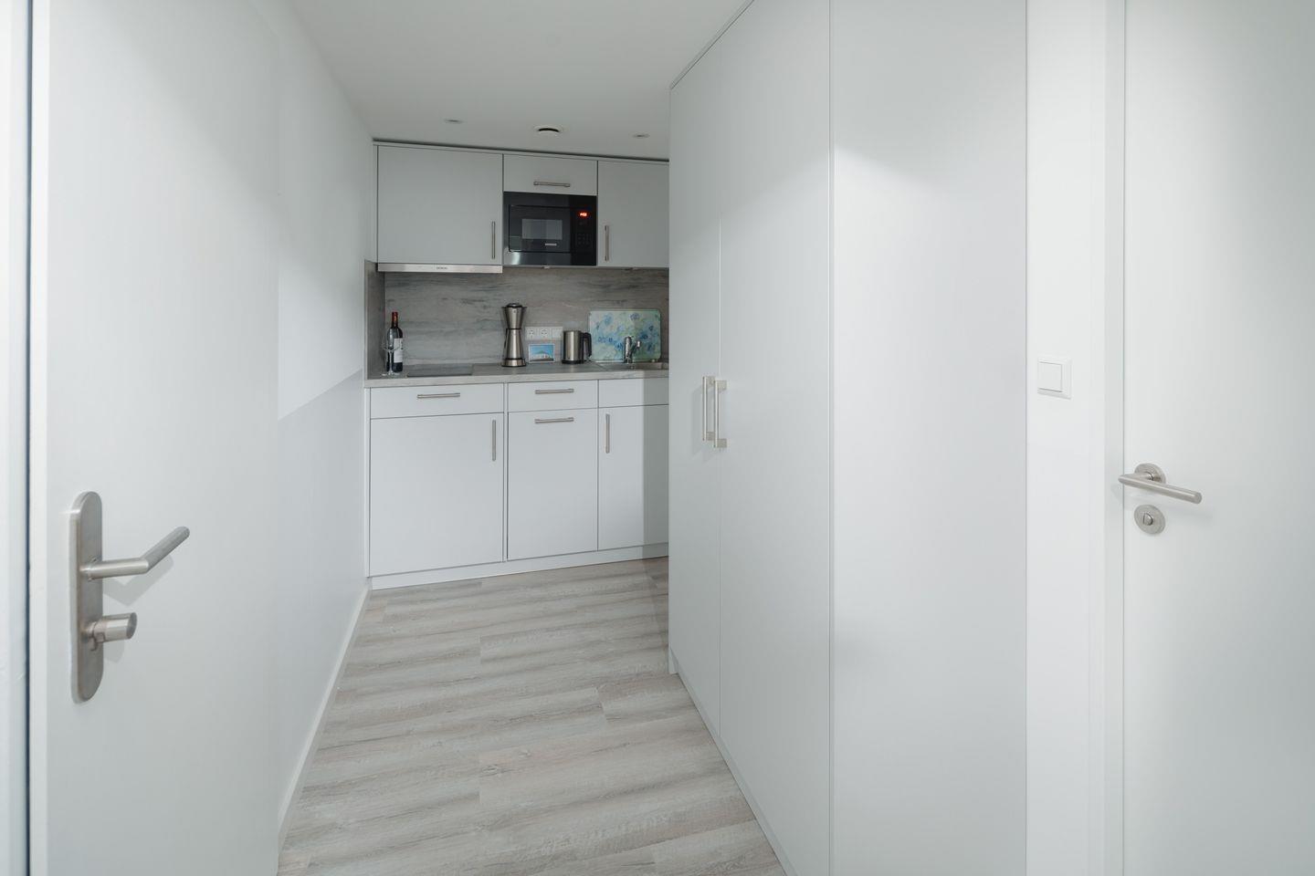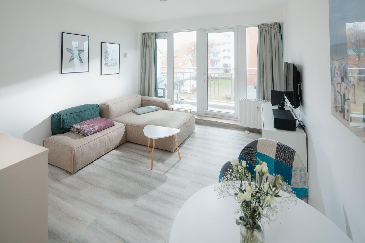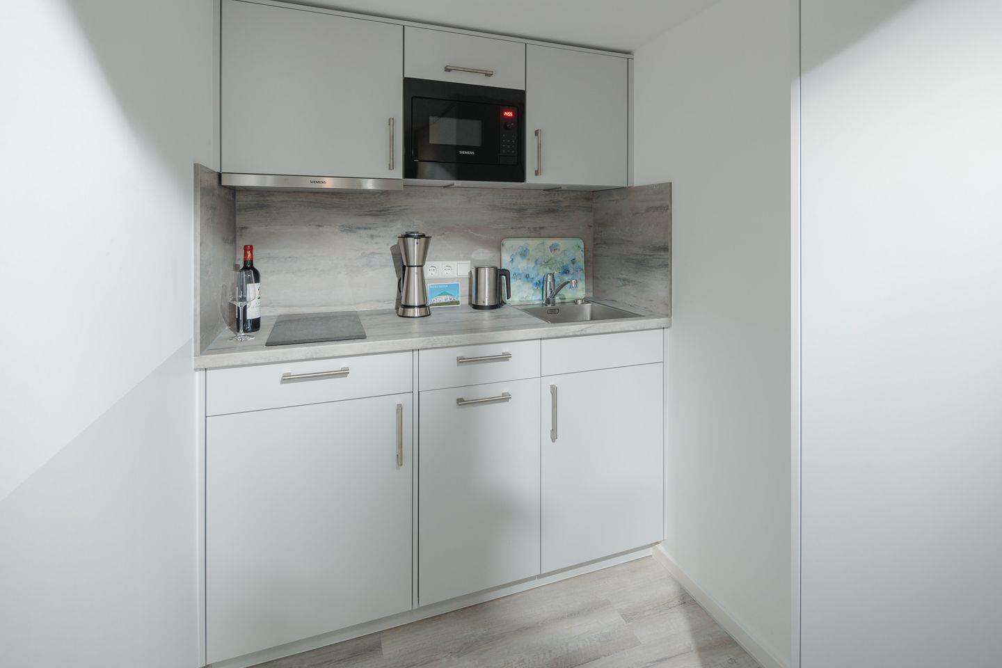 Das Wohn-/Schlafzimmer ist mit einem Doppelbett (1,60m x 2,00m) ausgestattet. Der Vorraum, der auch als Flur und Küche dient, wurde mit einer Einbauküche (ohne Backofen, mit Mikrowelle) ausgestattet. Das Badezimmer der Wohnung ist mit einer Dusche, einem WC und einem Handwaschbecken ausgestattet. Im Apartmenthaus "Kaiserhof" stehen den Bewohnern eine Waschmaschine und ein Wäschetrockner (beide mit Münzeinwurf) zur Verfügung. Zusätzlich steht eine Sauna bereit, die ebenfalls gegen Münzeinwurf nutzbar ist. Es ist zu beachten, dass das Schwimmbad aufgrund eines technischen Defektes geschlossen ist. Fahrräder können vor dem Haus (Nordseite) oder im Fahrradraum abgestellt werden. Hier darf auch der vierbeinige Freund mitkommen, denn die Ferienwohnung heißt auch Hunde herzlich willkommen. Erlaubt sind maximal 2 Hunde (Höhe maximal kniehoch). Die Hundewiese befindet sich in der Nähe des Fährhafens (kein Leinenzwang).