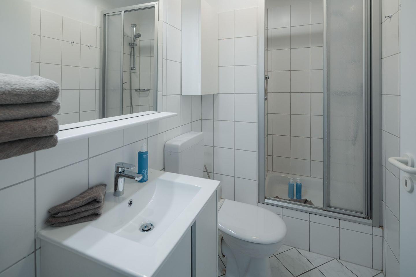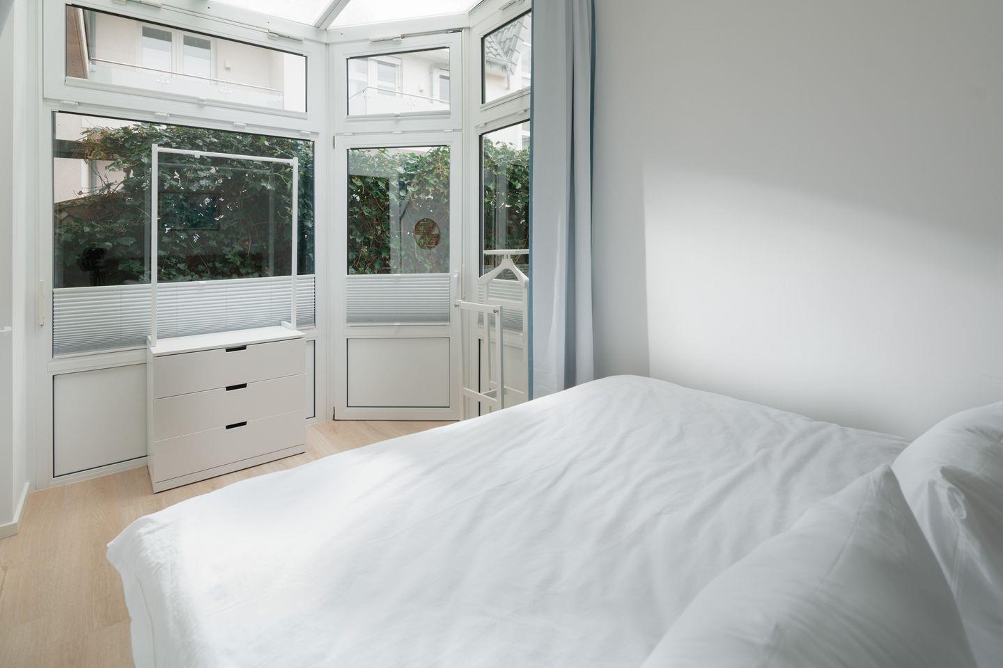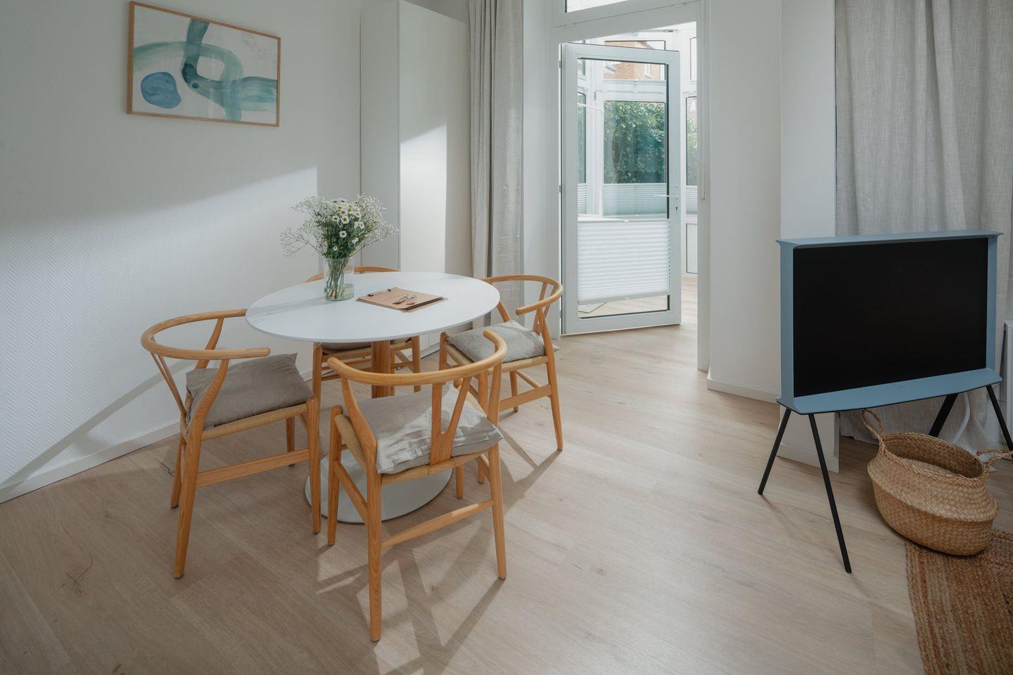 Die Wohnung ist komplett ausgestattet und bietet alles, was Sie für einen angenehmen Aufenthalt benötigen. Das Schlafzimmer verfügt über ein komfortables Boxspringbett der Größe 180x200cm. Von hier gelangen Sie zur wohnungseigenen Terrasse in östlicher Ausrichtung.