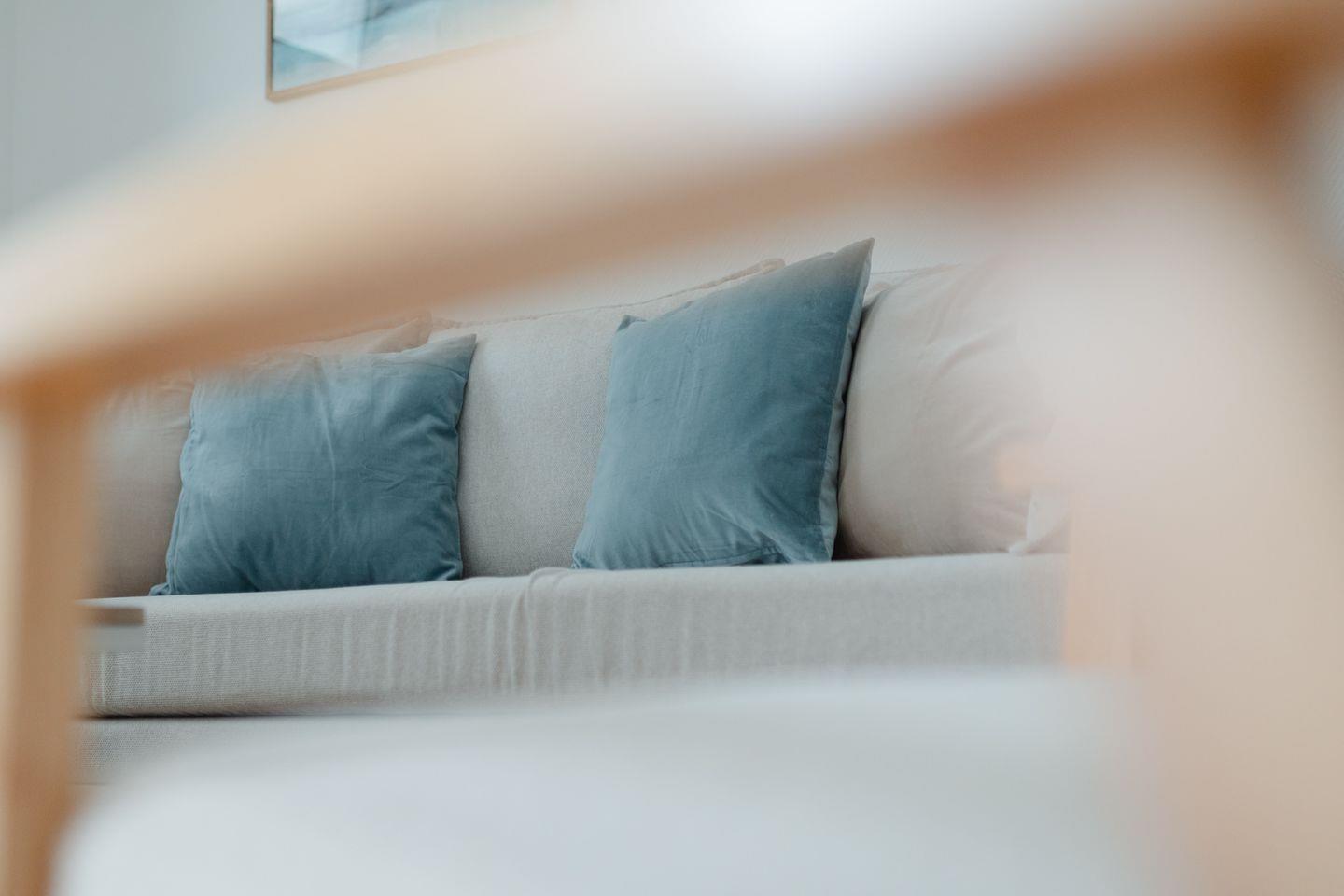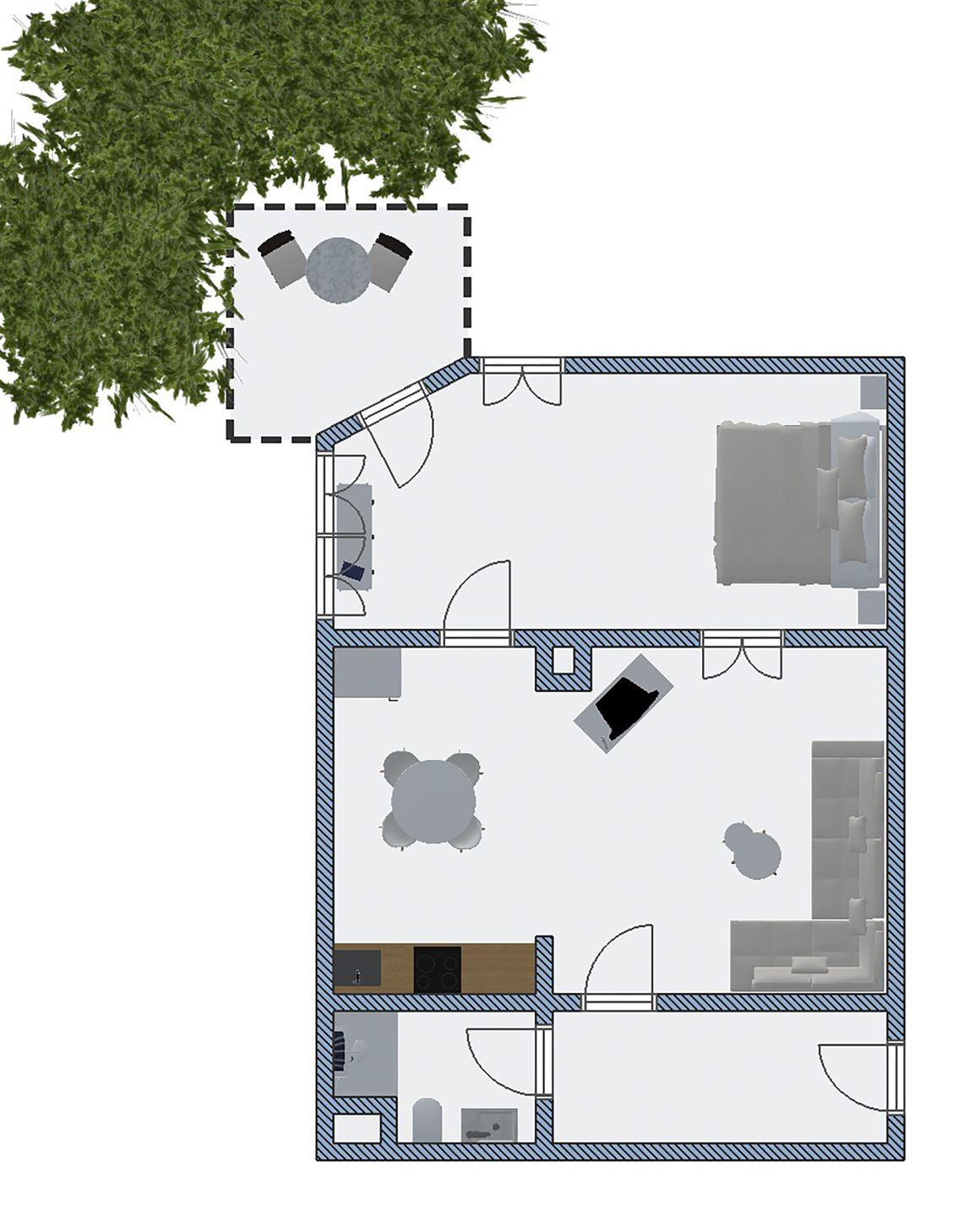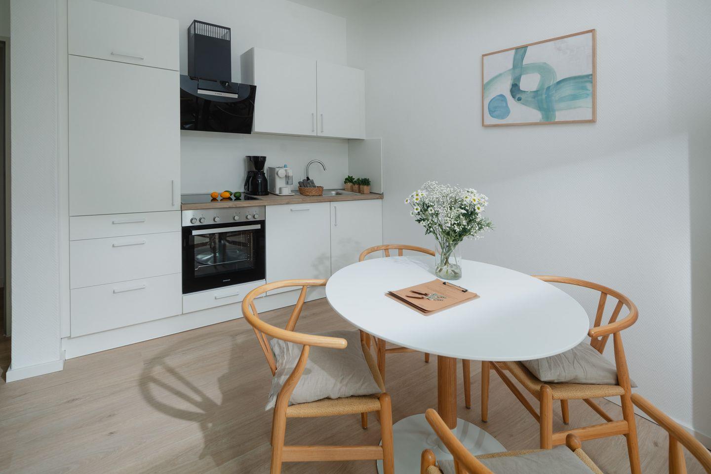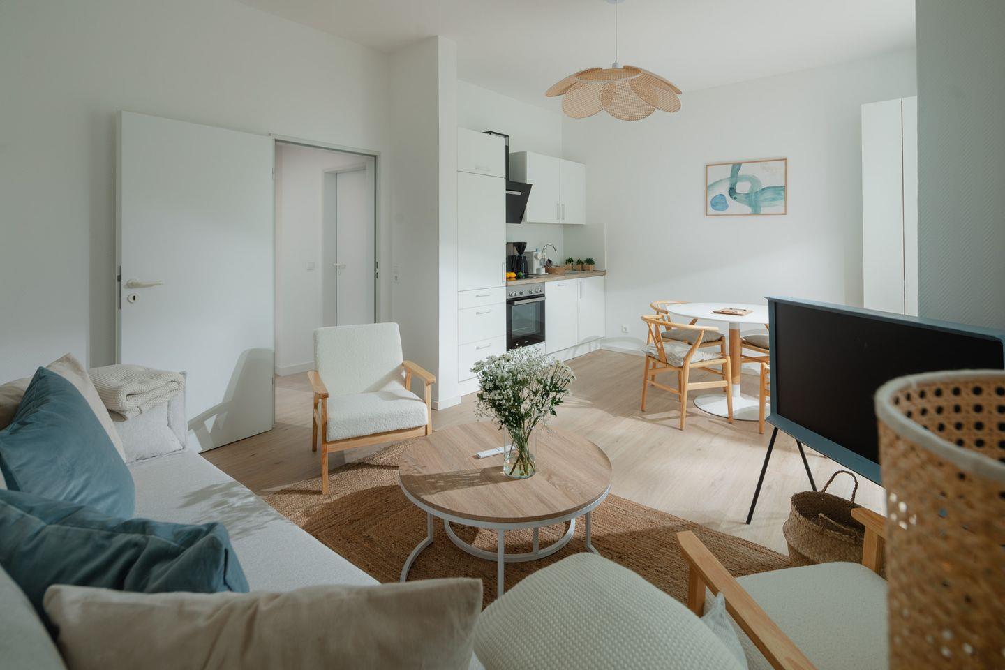 Die Wohnung ist komplett ausgestattet und bietet alles, was Sie für einen angenehmen Aufenthalt benötigen. Das Schlafzimmer verfügt über ein komfortables Boxspringbett der Größe 180x200cm. Von hier gelangen Sie zur wohnungseigenen Terrasse in östlicher Ausrichtung.
