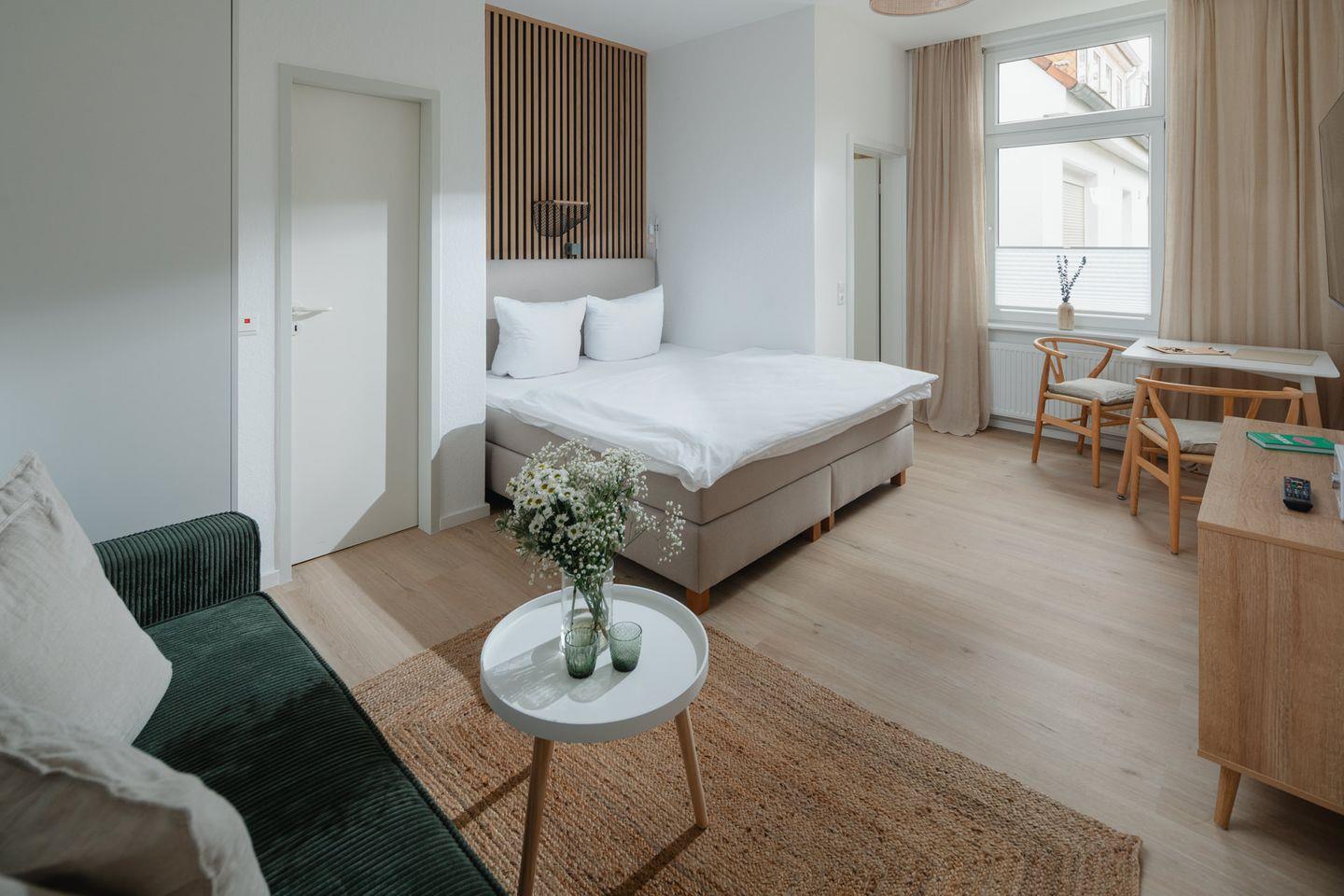 Das Apartment ist komplett ausgestattet und bietet alles, was Sie für einen angenehmen Aufenthalt benötigen. Für einen traumhaften Schlaf sorgt das Boxspringbett der Größe 180x200cm.