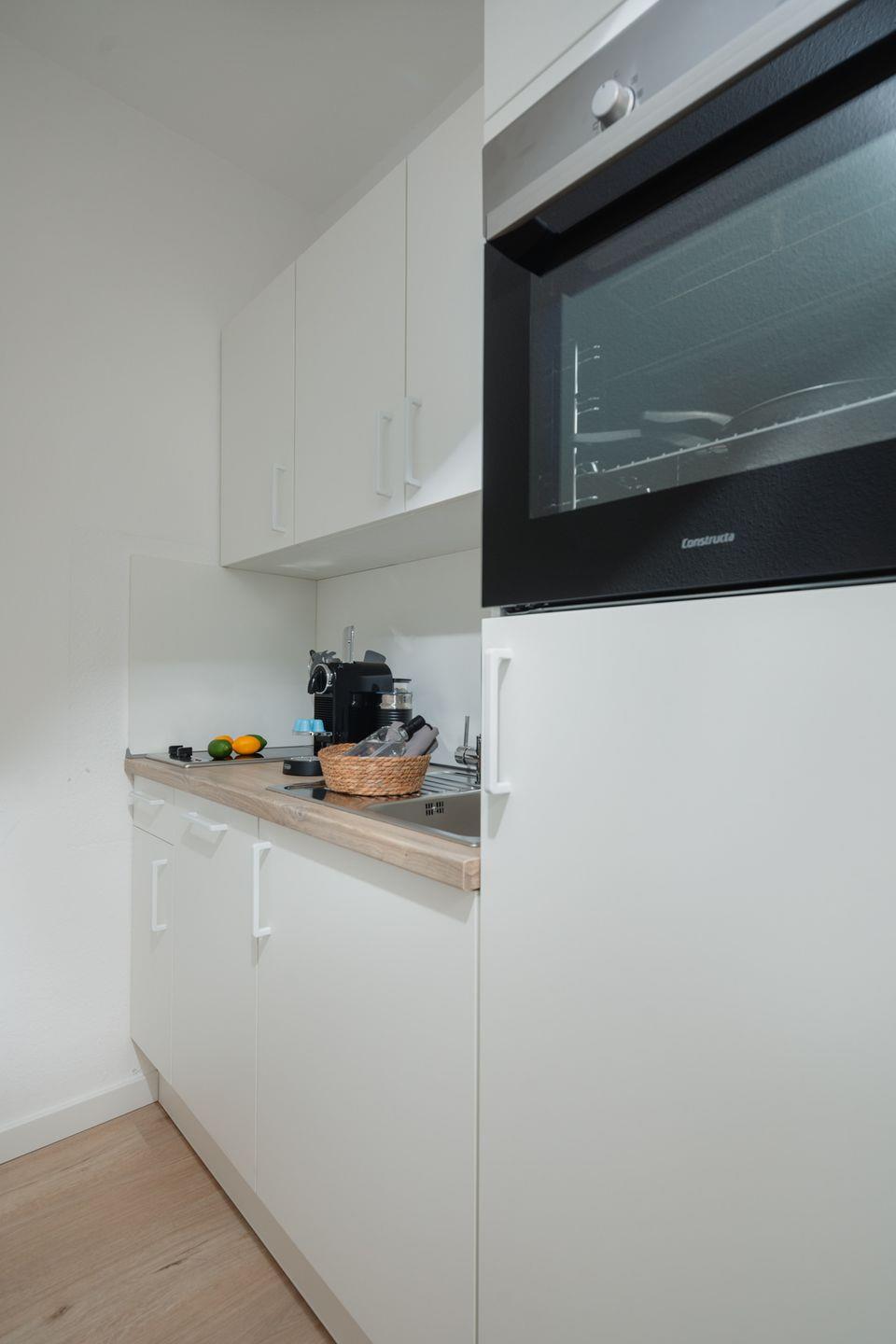 Das Badezimmer ist mit einem Waschbecken, einem WC sowie einer Dusche ausgestattet. Die seperate Küche ist umfassend ausgestattet mit Kühlschrank, Gefrierfach, Ceranfeld, Backofen, Kaffeemaschine und einer Nespresso-Kapselmaschine.