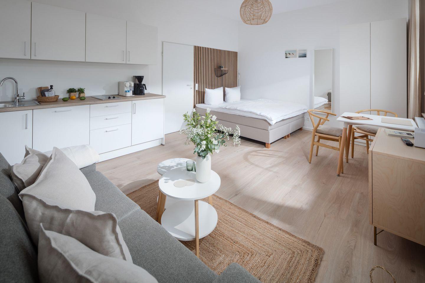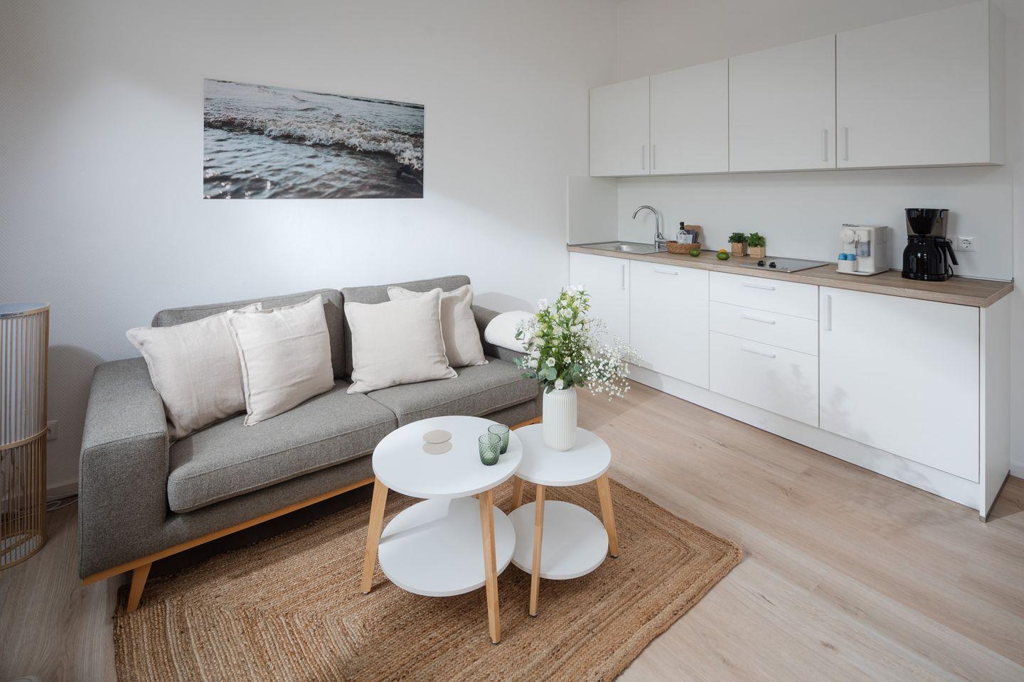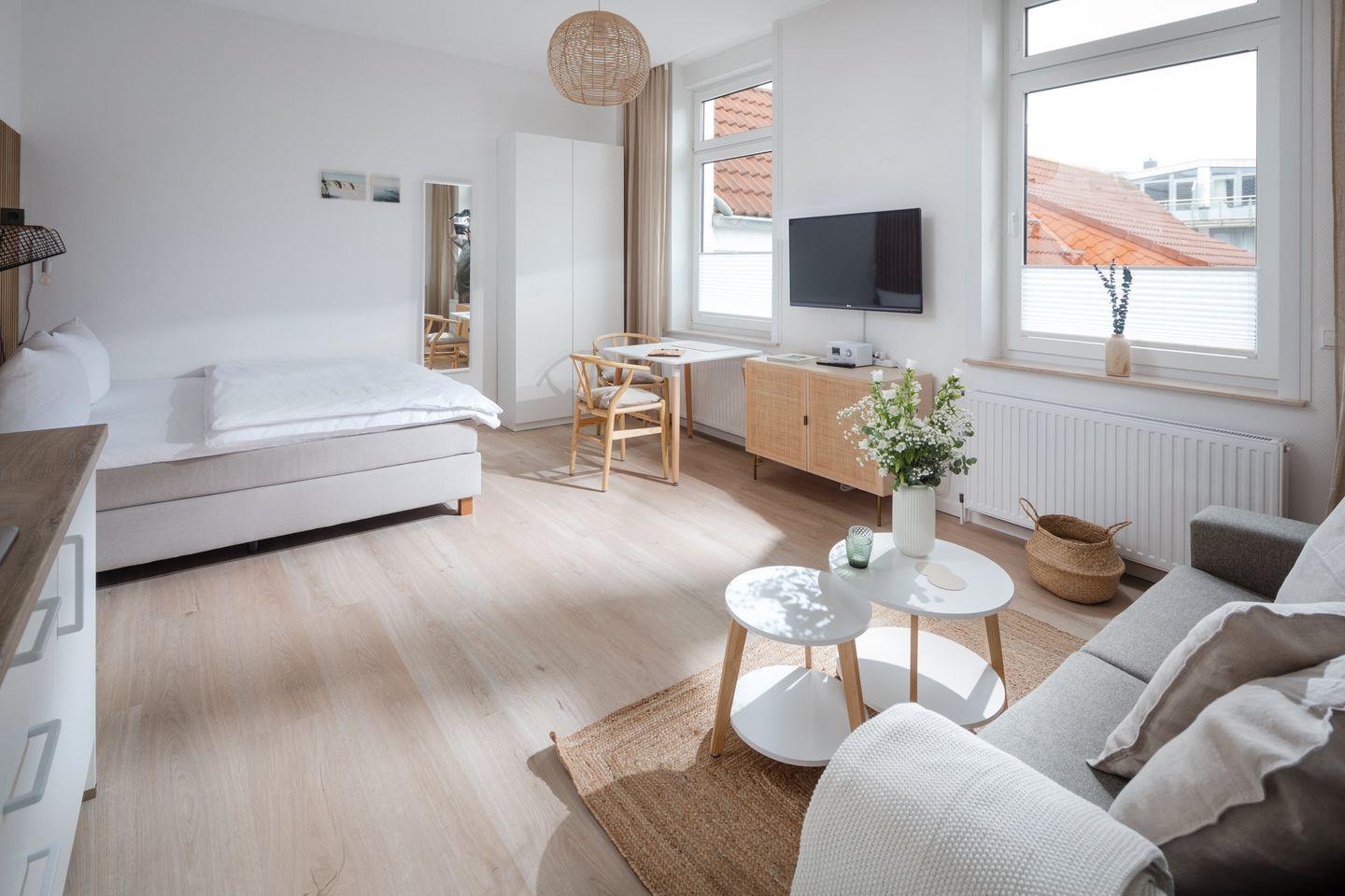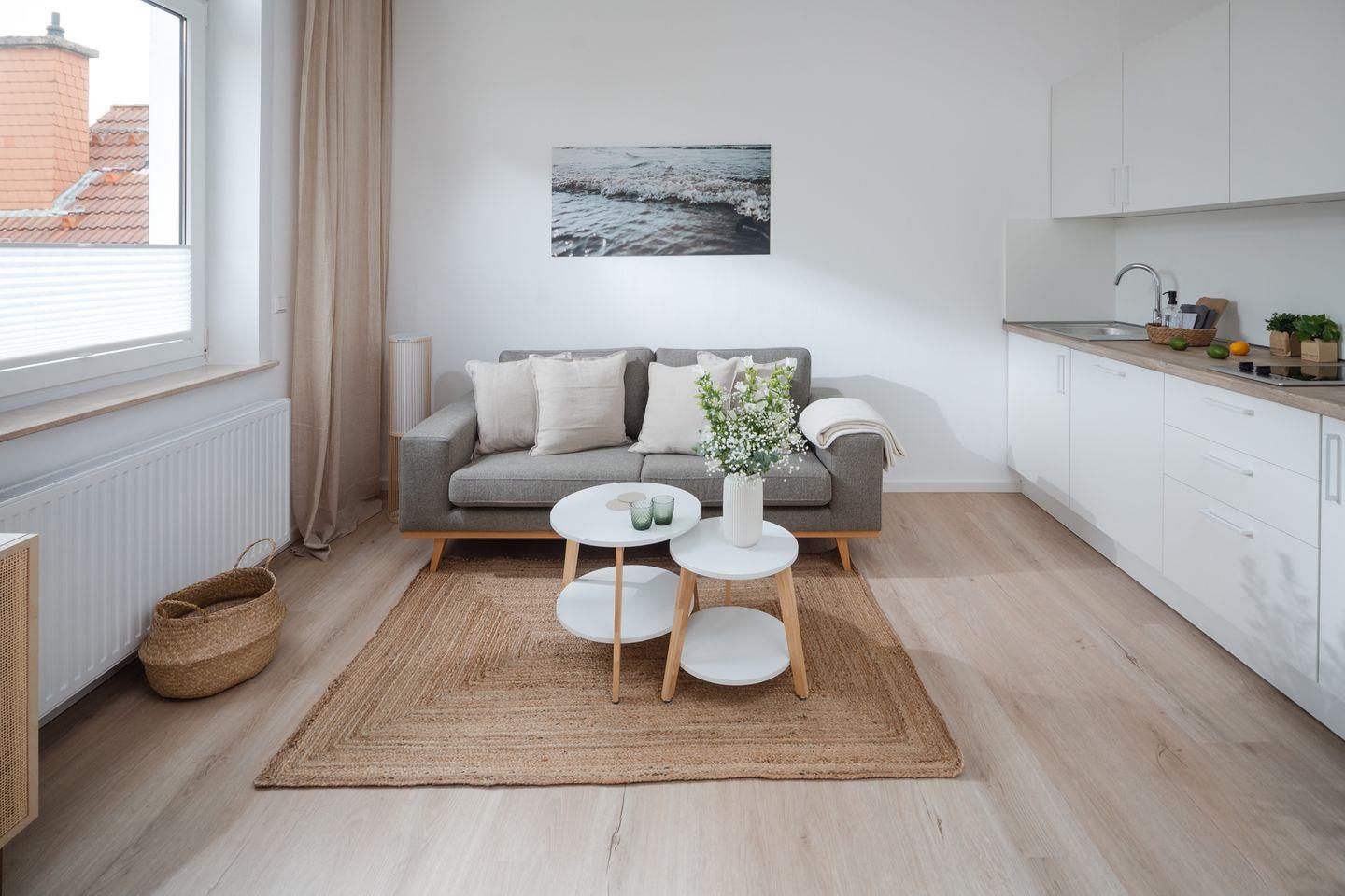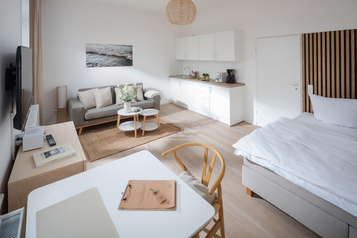 Herzlich willkommen im Apartment B09 im frisch renovierten Haus Bismarck 1884! Dieses gemütliche Einzimmer-Apartment verbindet modernen Komfort mit dem charmanten skandinavischen Stil. Die frisch gestalteten Räumlichkeiten bieten eine einladende Atmosphäre für einen angenehmen Aufenthalt.