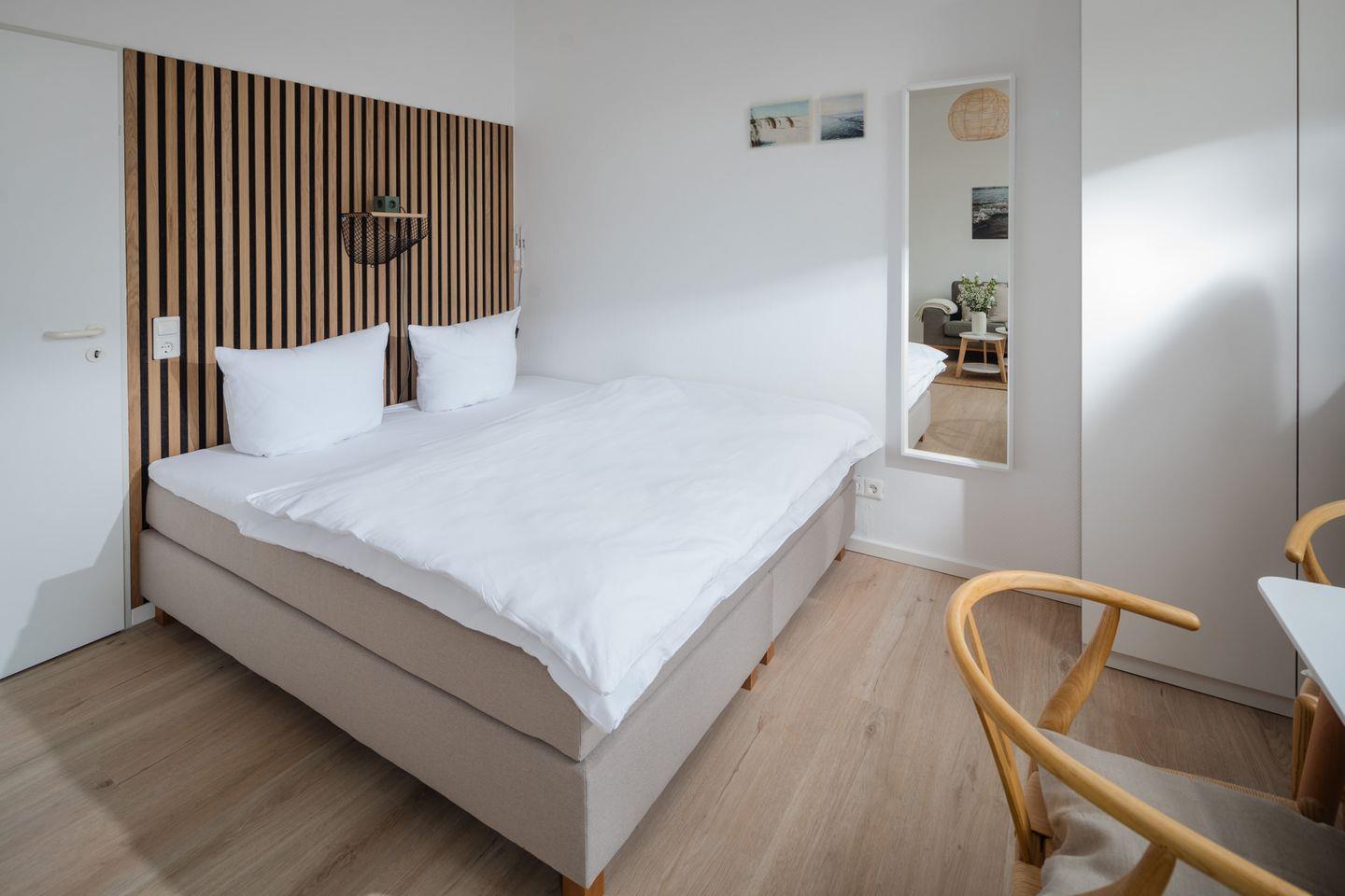 Die neue Küche ist komplett ausgestattet und lädt dazu ein, leckere Mahlzeiten zuzubereiten. Hier finden Sie moderne Geräte und alles, was Sie für die Zubereitung Ihrer Lieblingsspeisen benötigen. Die neuen Möbel setzen Akzente im skandinavischen Design und schaffen eine Wohlfühlatmosphäre. Für einen traumhaften Schlaf sorgt das Boxspringbett der Größe 180x200cm.