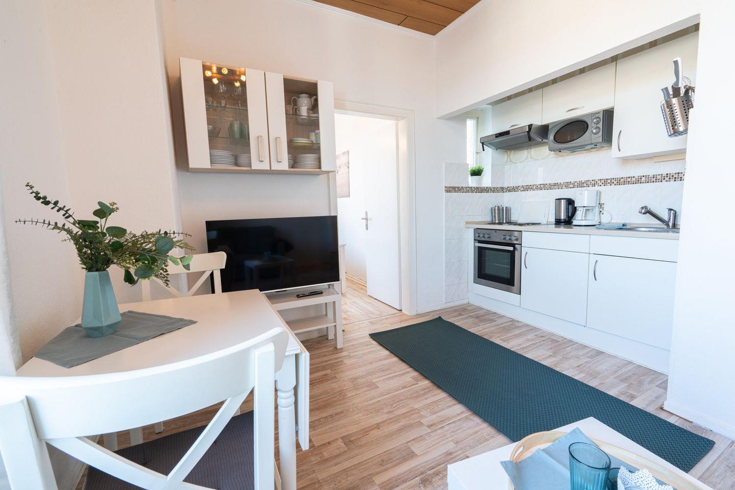 Küchenzeile, Esstisch und Fernseher. Kostenfreies WLAN steht selbstverständlich
