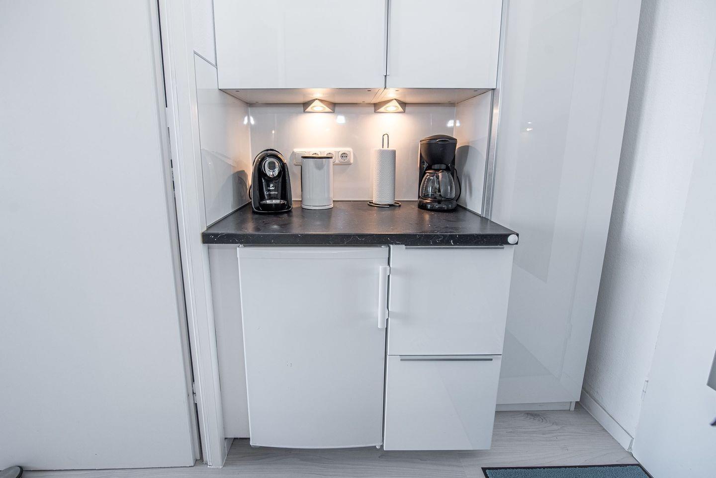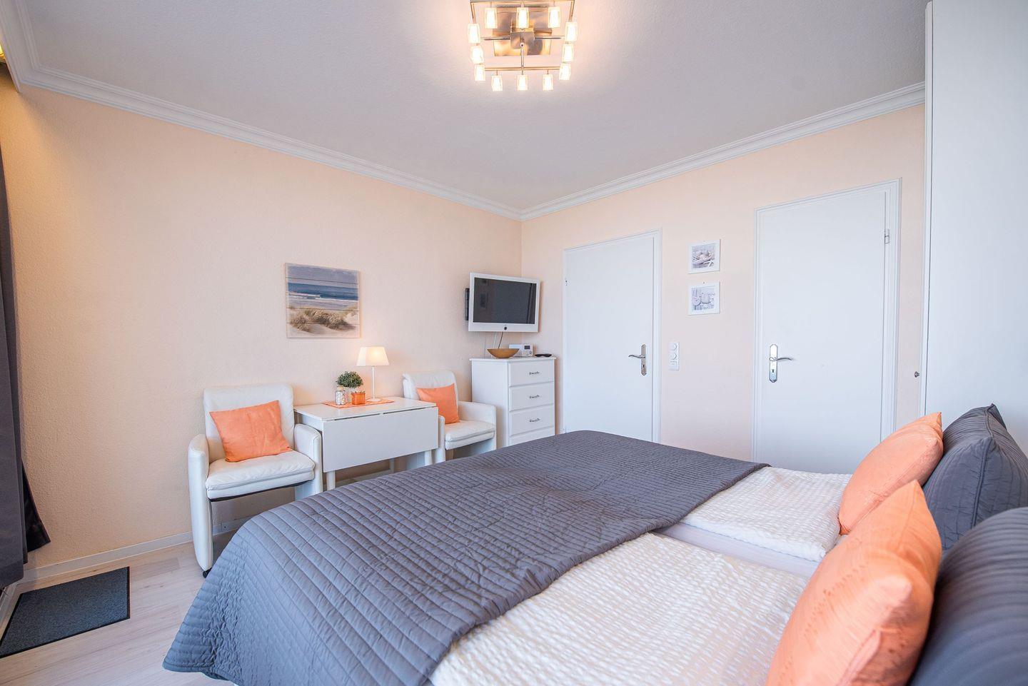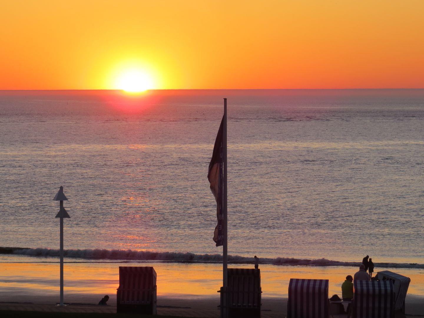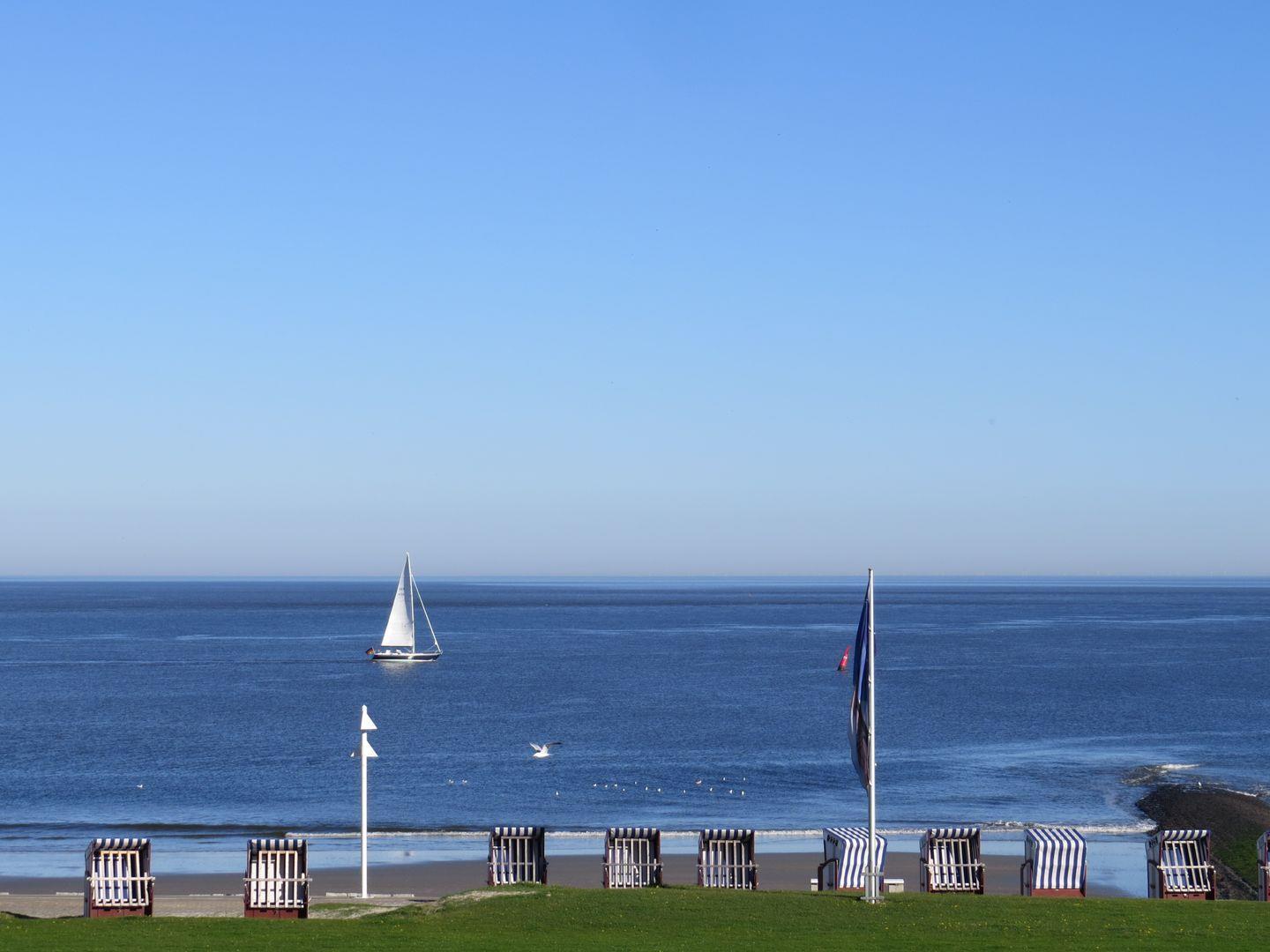 Diese gemütlich eingerichtete 1-Zimmer Wohnung von ca. 28 m² befindet sich im 2. Obergeschoß und bietet Komfort und Gemütlichkeit auf kleinem Raum. Sie verfügt über einen Balkon ausgestattet mit Tisch und Stühlen, mit einem traumhaften Blick auf die Nordsee und der Nordstrand-Promenade. Die Wohnung verfügt im Eingangsbereich über eine Küche die komplett mit Herd mit Ceran-Kochfeld, Kühlschrank mit Gefrierfach, Spülmaschine, Kaffeemaschine, Toaster und Wasserkocher ausgestattet ist. Ein kleiner Essbereich für 2 Personen lädt zum gemütlichen Essen ein. Im Wohn-Schlafbereich befindet sich ein großzügiges Bett (1.80 m x 2.00 m) sowie ein Kleiderschrank, der ausreichend Platz bietet. Die Wohnung verfügt über einen Flachbildfernseher mit TV-SAT Anschluss und einen Radio-CD Player. Das Badezimmer ist mit Dusche / WC und Haartrockner ausgestattet. Es handelt sich um eine Nichtraucherwohnung. Waschmaschine und Trockner befinden sich unten im Haus im Gemeinschaftskeller und können durch ein Münzzahlsystem genutzt werden. Es befindet sich ein Kostenfreier W-LAN Zugang in der Wohnung.
