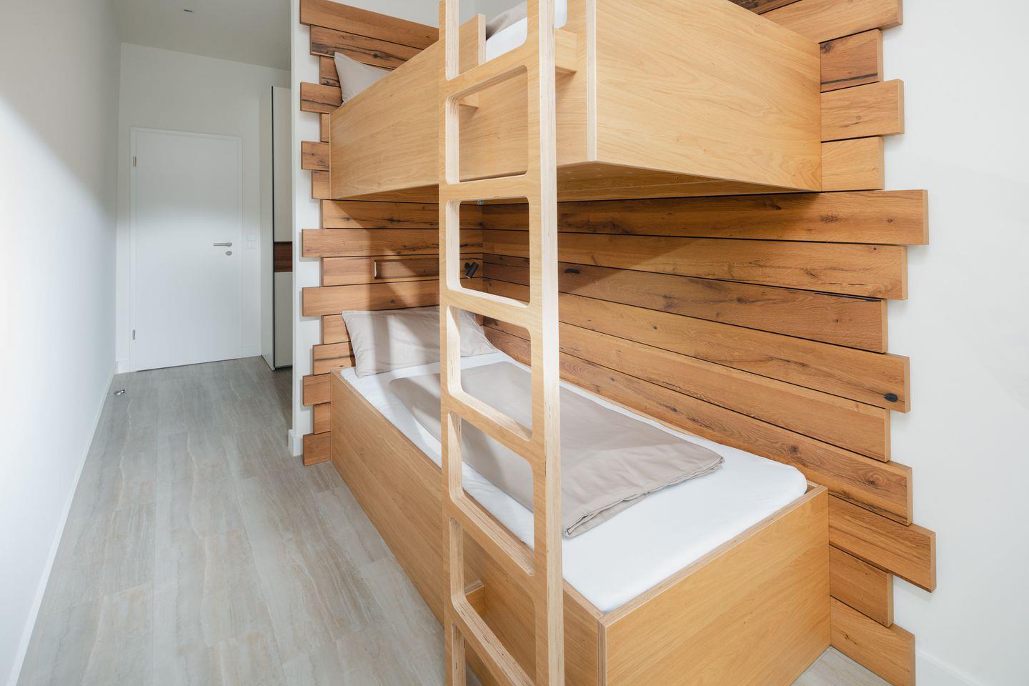 Erdgeschoss mit Wintergarten: Die Wohnung E5 liegt im Erdgeschoss (Achtung: nicht stufenlos erreichbar) und verfügt über einen Wintergarten mit Klimaanlage und Fußbodenheizung. Zur Ausstattung der Küche gehören unter anderem ein 2-Platten-Herd sowie eine Mikrowelle, ein Geschirrspüler, eine Filterkaffeemaschine und eine Kapselkaffeemaschine. Fahrräder der Hausgäste können im Innenhof abgestellt werden; Waschmaschine und Wäschetrockner stehen zur gemeinschaftlichen Nutzung im Untergeschoss bereit.