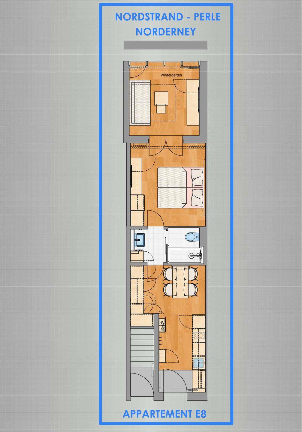 Erdgeschoss mit Wintergarten: Die Wohnung E8 liegt im Erdgeschoss (Achtung: nicht stufenlos erreichbar) und verfügt über einen Wintergarten mit Klimaanlage und Fußbodenheizung. Zur Ausstattung der Küche gehören unter anderem ein 2-Platten-Herd sowie eine Mikrowelle, ein Geschirrspüler, eine Filterkaffeemaschine und eine Kapselkaffeemaschine. Fahrräder der Hausgäste können im Innenhof abgestellt werden; Waschmaschine und Wäschetrockner stehen zur gemeinschaftlichen Nutzung im Untergeschoss bereit.