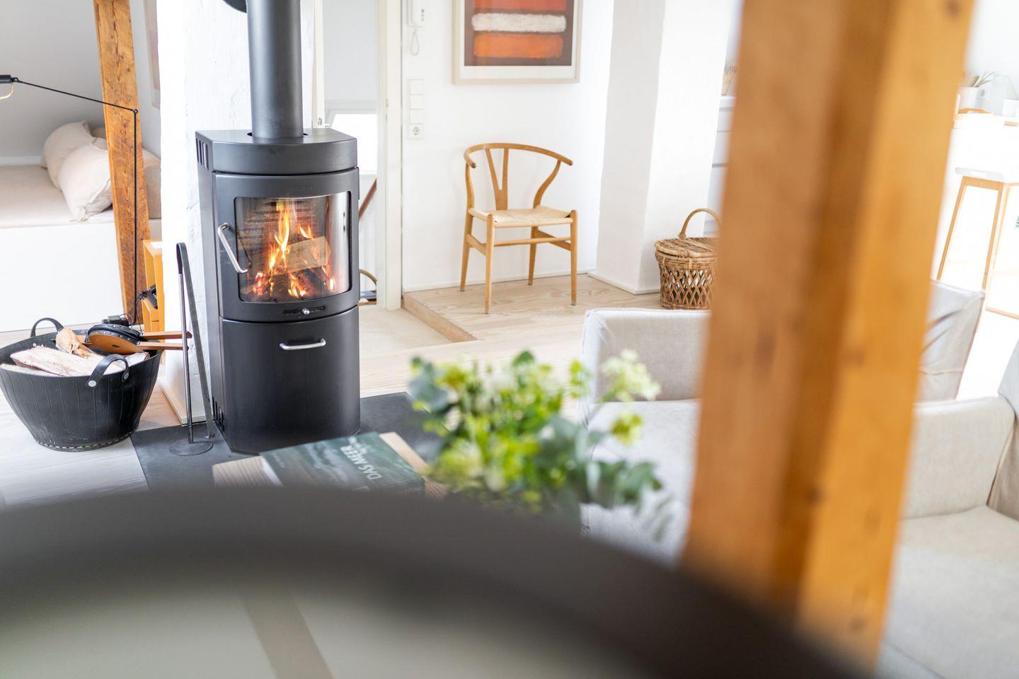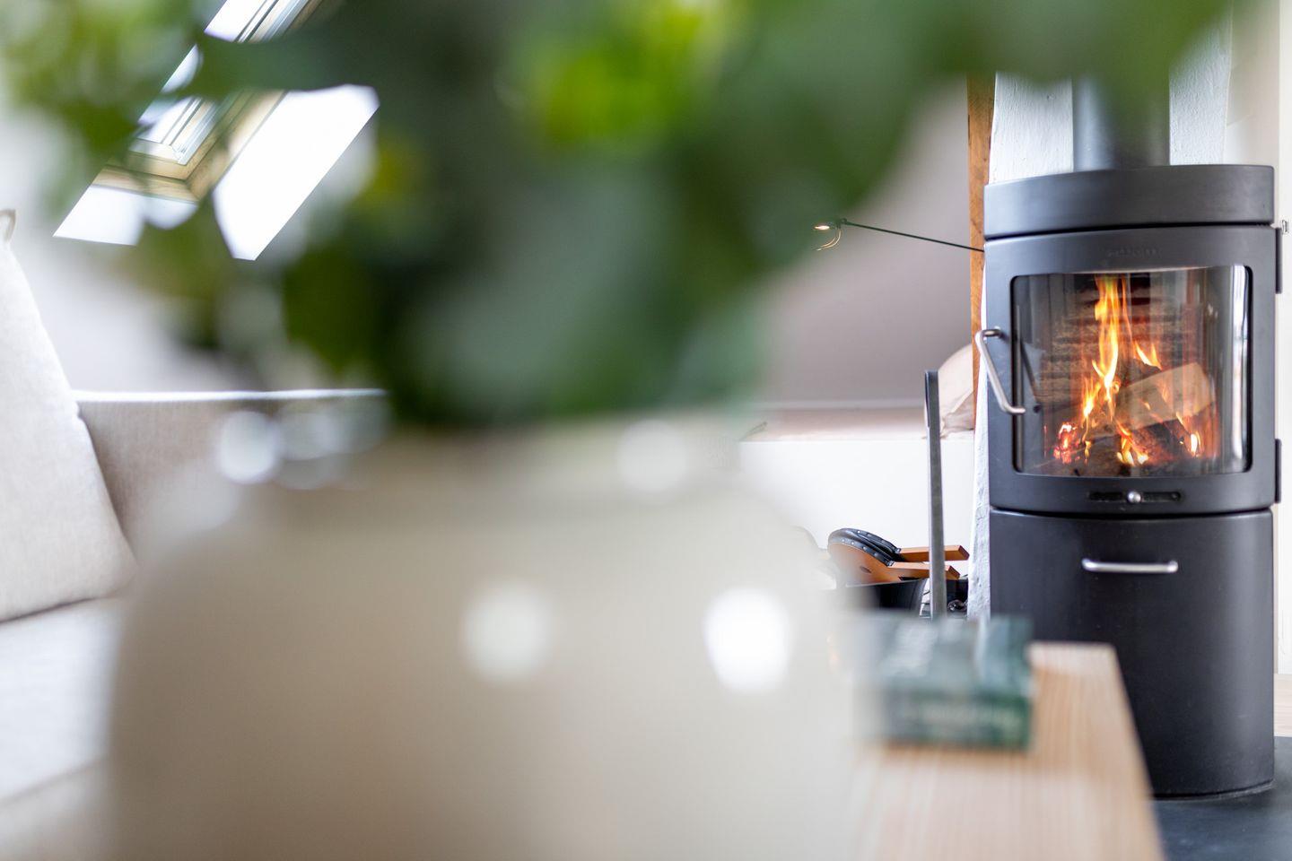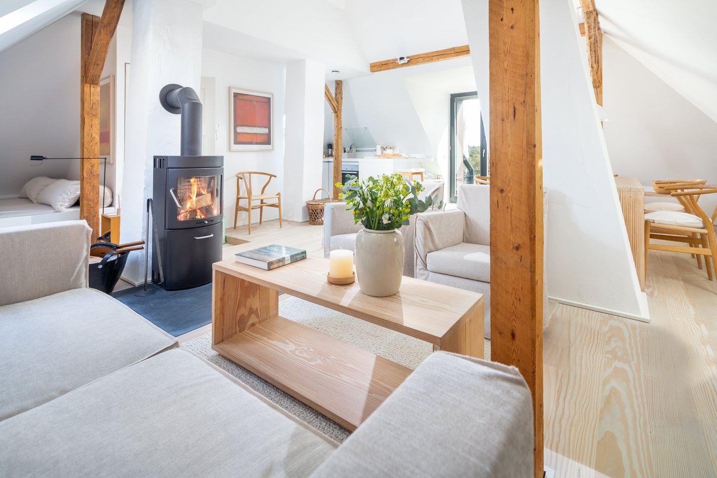 Der großzügige Wohnbereich im Obergeschoss lädt zum Verweilen ein und verfügt über eine offene Küche, einen Essbereich und einen einladenden Kamin, der für wohlige Atmosphäre sorgt. Eine zusätzliche Nische mit einem weiteren Bett bietet flexiblen Schlafplatz für weitere Gäste.