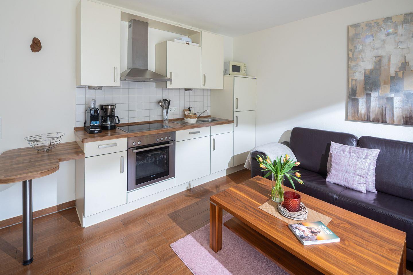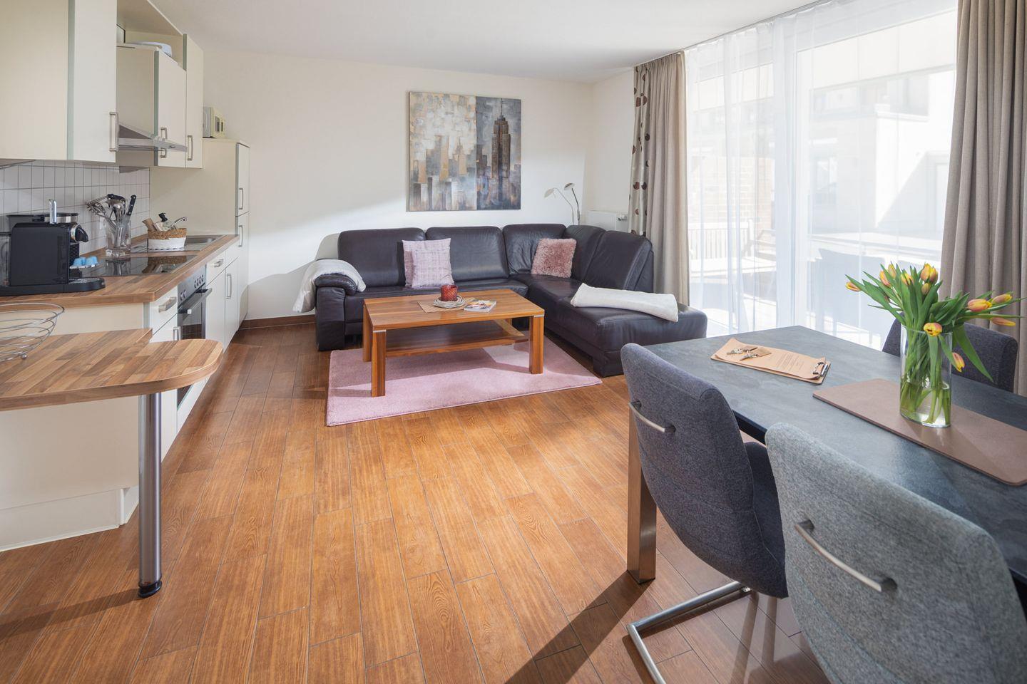 Die Wohnung verfügt über zwei gemütliche Schlafzimmer, jeweils ausgestattet mit einem komfortablen Doppelbett und Verdunkelungsmöglichkeiten für erholsamen Schlaf. Der offene Wohnbereich kombiniert eine gut ausgestattete Küche mit dem Ess- und Wohnbereich. Die Küche bietet moderne Geräte wie Cerankochfeld, Backofen, Mikrowelle, Kühlschrank mit Gefrierfach, Geschirrspüler, Kaffeemaschine, Wasserkocher und Toaster. Ein Esstisch lädt zu gemeinsamen Mahlzeiten ein, während die angrenzende Sofaecke mit TV zum Entspannen einlädt.?