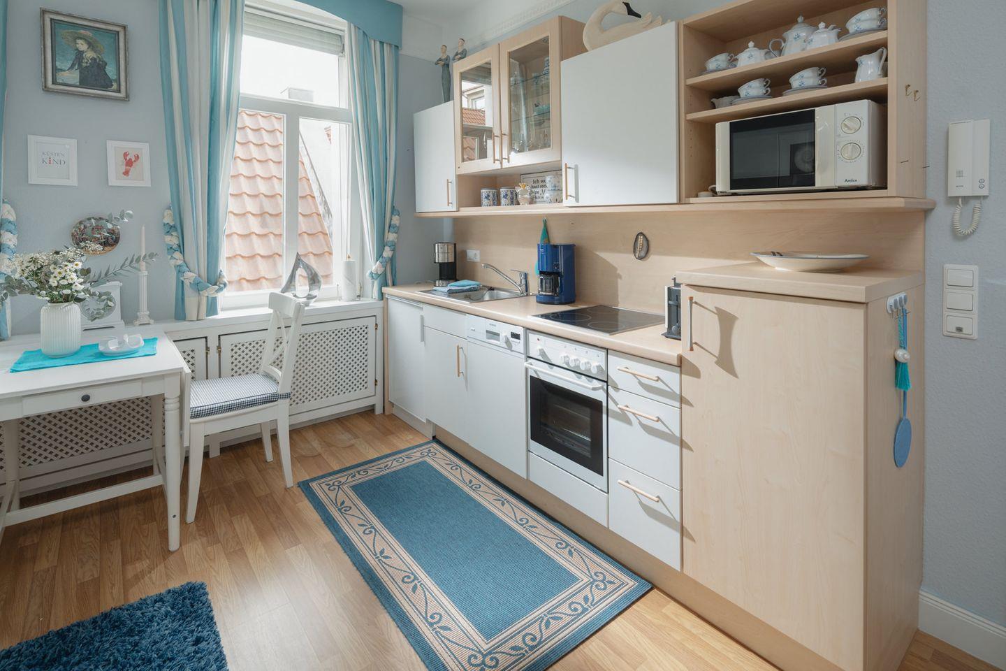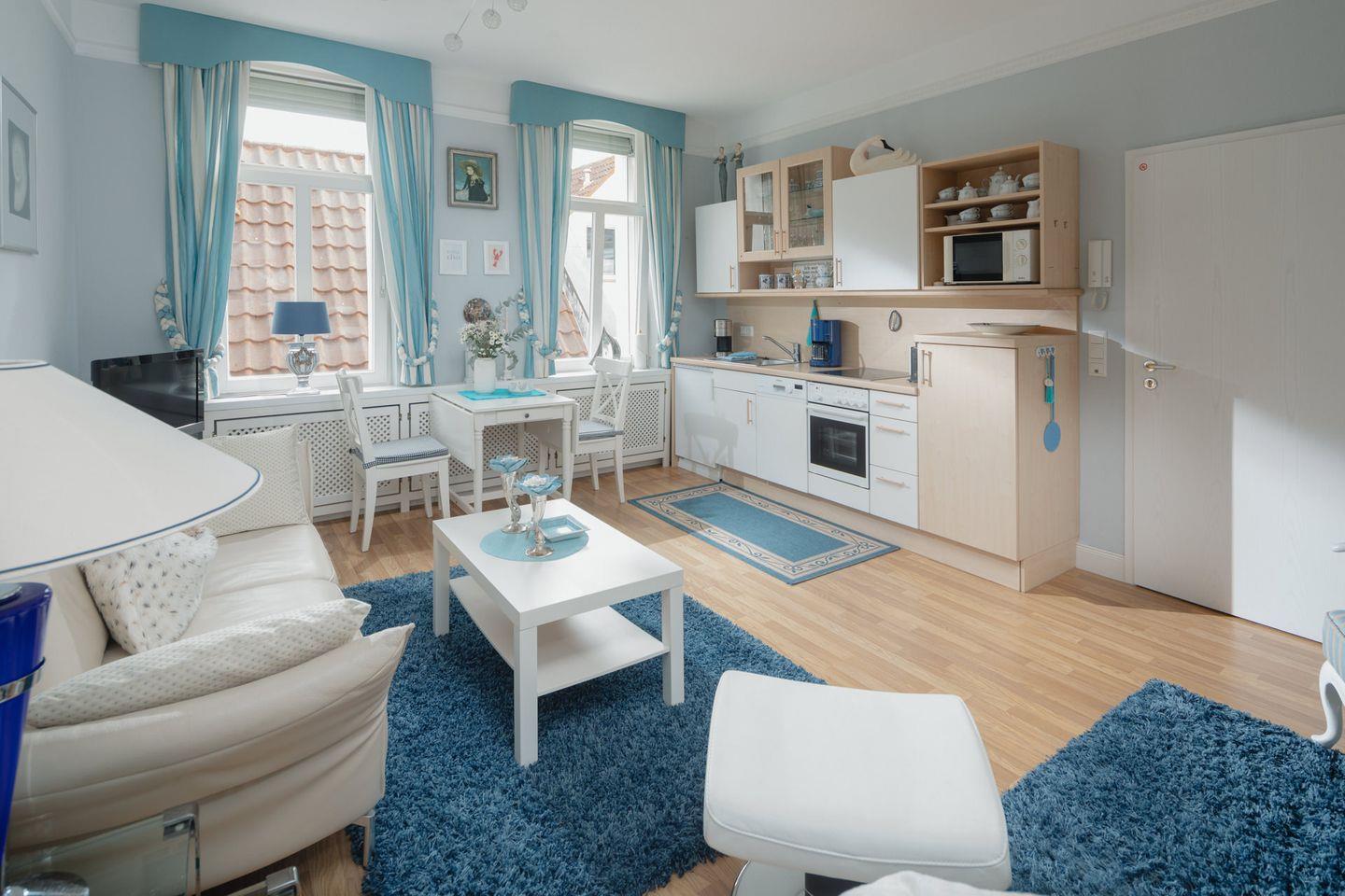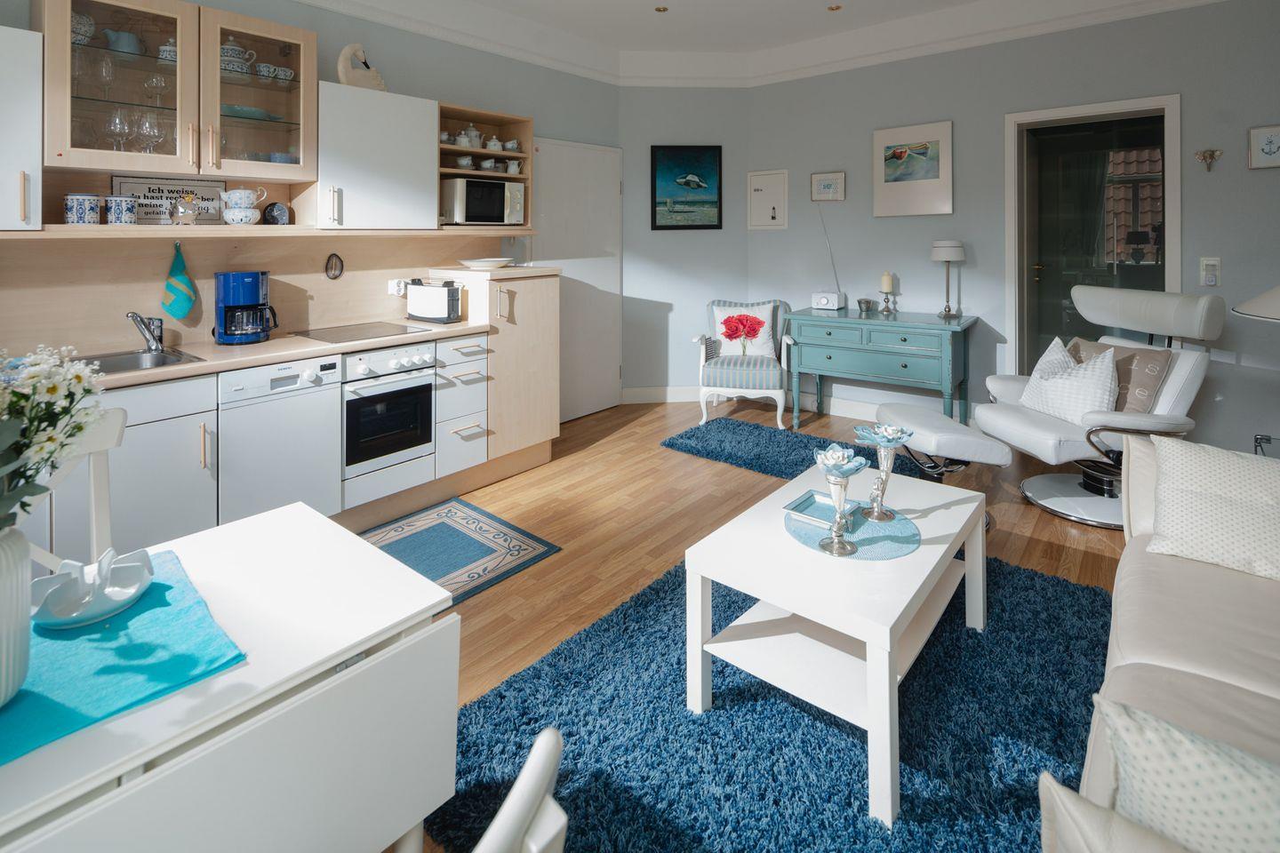 Die Ferienwohnung liegt im Hochparterre des Gebäudes und ist über nur wenige Stufen erreichbar. Sie besteht auf zwei Zimmern. Einem Wohnzimmer mit integrierter Küchenzeile und einem separaten Schlafzimmer (Doppelbett 1,80m x2,00m) sowie einem modernen Badezimmer. Die Küchenzeile im Wohnzimmer ist praktisch ausgestaltet, unter anderem mit einer Kaffee-Pad-Maschine (WMF), einer Mikrowelle und einer Geschirrspülmaschine (ohne Backofen). Waschmaschine und Wäschetrockner befinden sich im Haus und stehen (für die gemeinschaftliche Nutzung gegen Gebühr) zur Verfügung, was besonders für längere Aufenthalte von Vorteil ist. Hier dürfen auch Hunde mitkommen, denn die Ferienwohnung heißt auch Hunde herzlich willkommen. Erlaubt ist maximal 1 Hund (Höhe maximal kniehoch). Die Hundewiese befindet sich in der Nähe des Fährhafens (kein Leinenzwang).