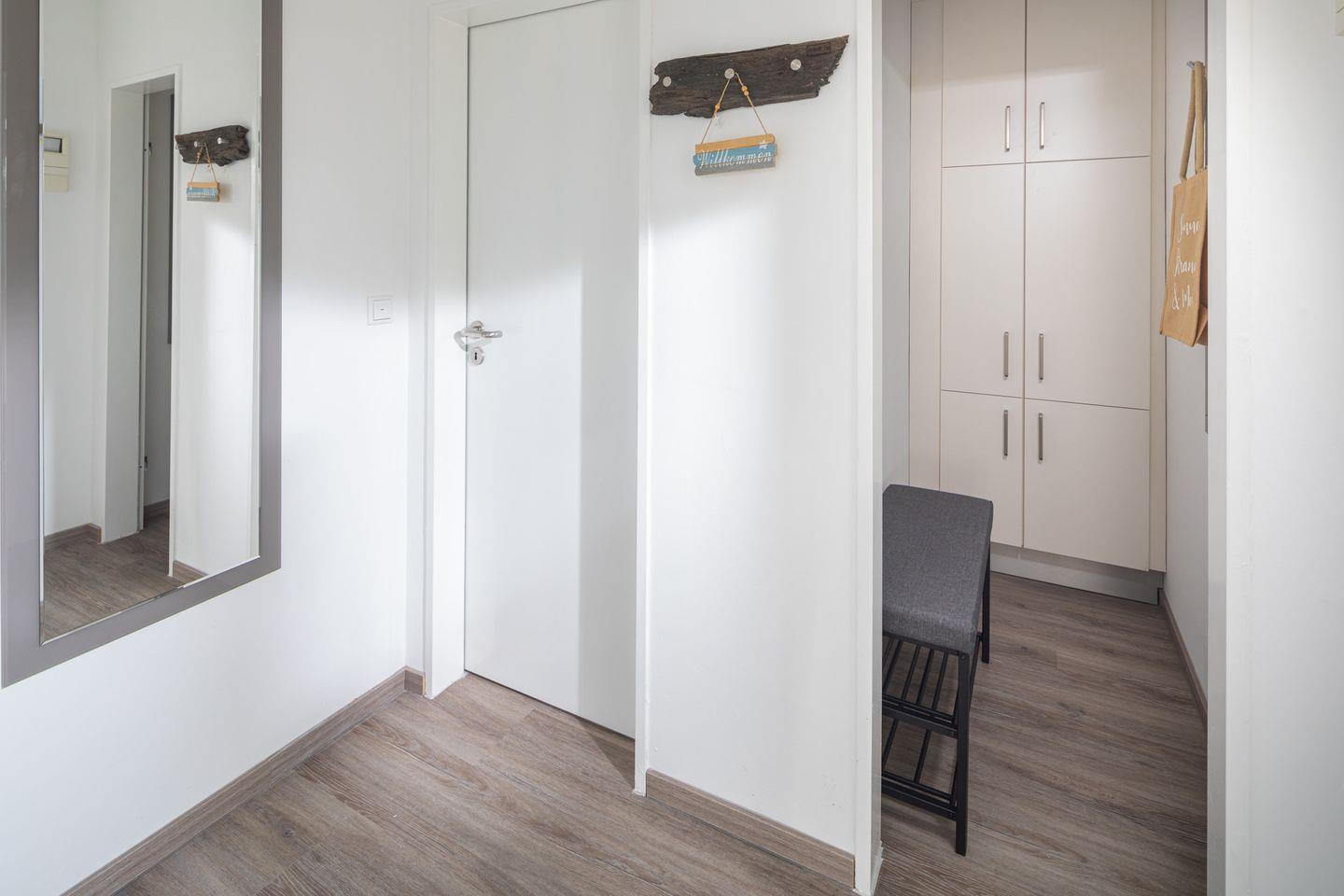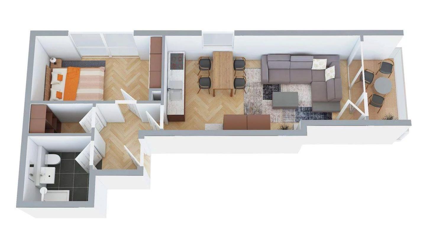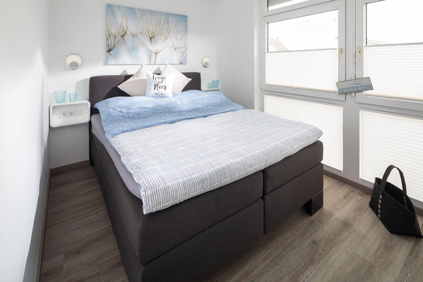 Ein separates Schlafzimmer mit einem komfortablen Boxspringbett der Größe 1800x200cm sorgt für erholsame Nächte. Das moderne Badezimmer bietet alles, was Sie für Ihren Aufenthalt benötigen. Zudem können Sie frische Luft von Ihrem eigenen Balkon genießen.
