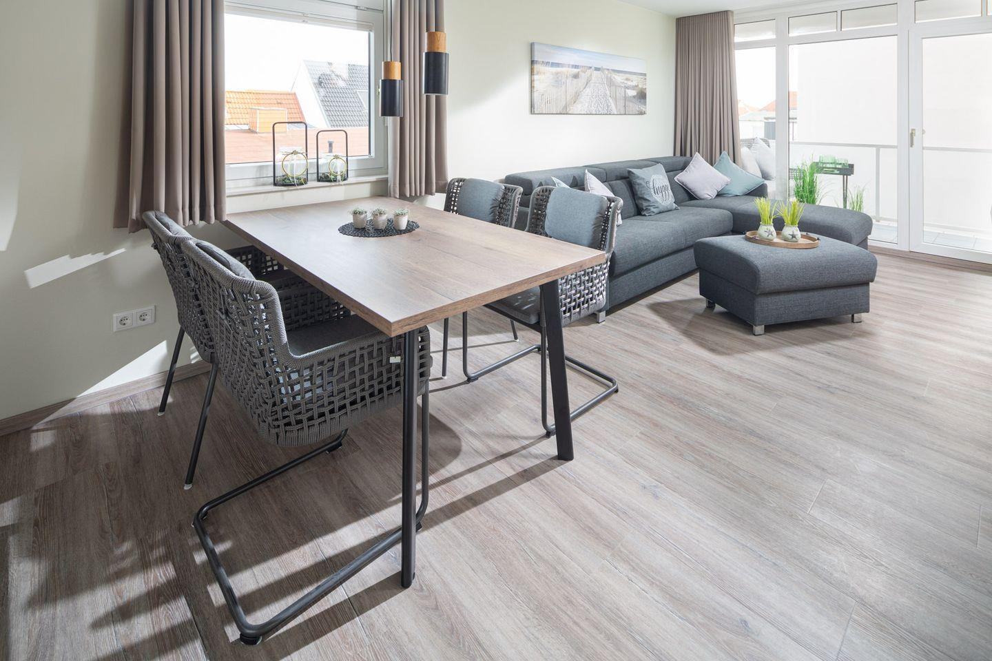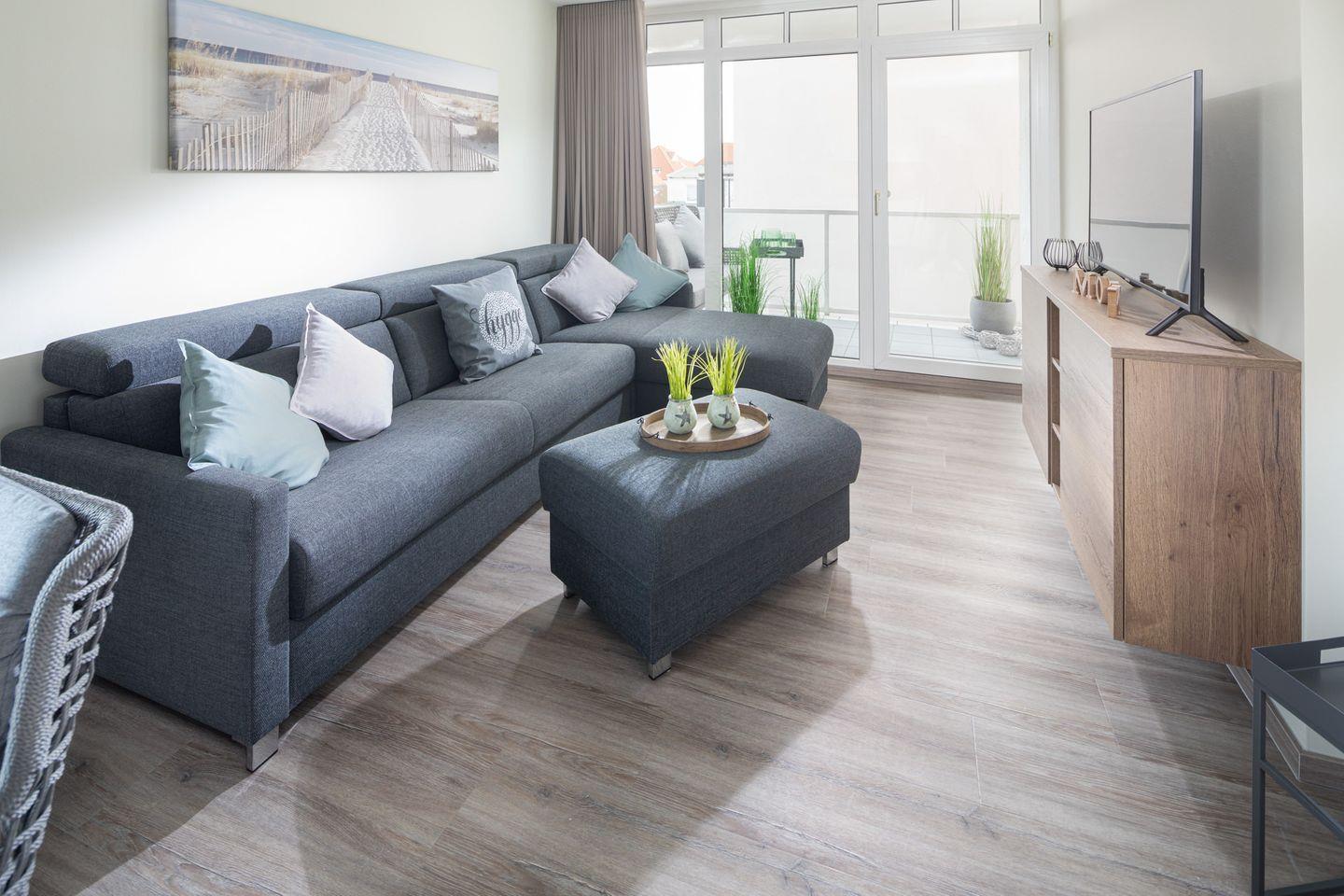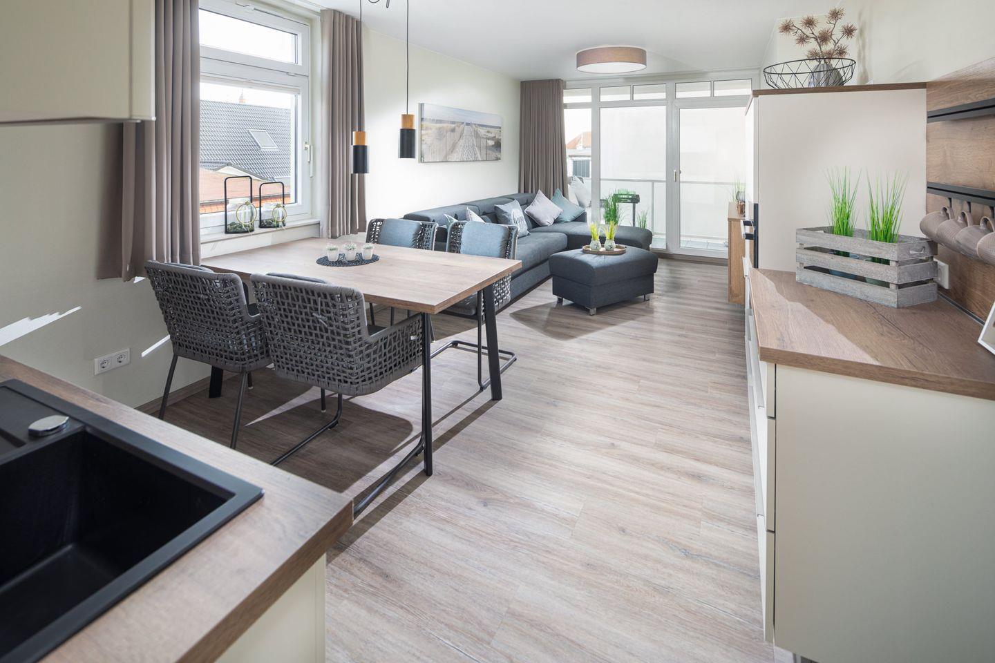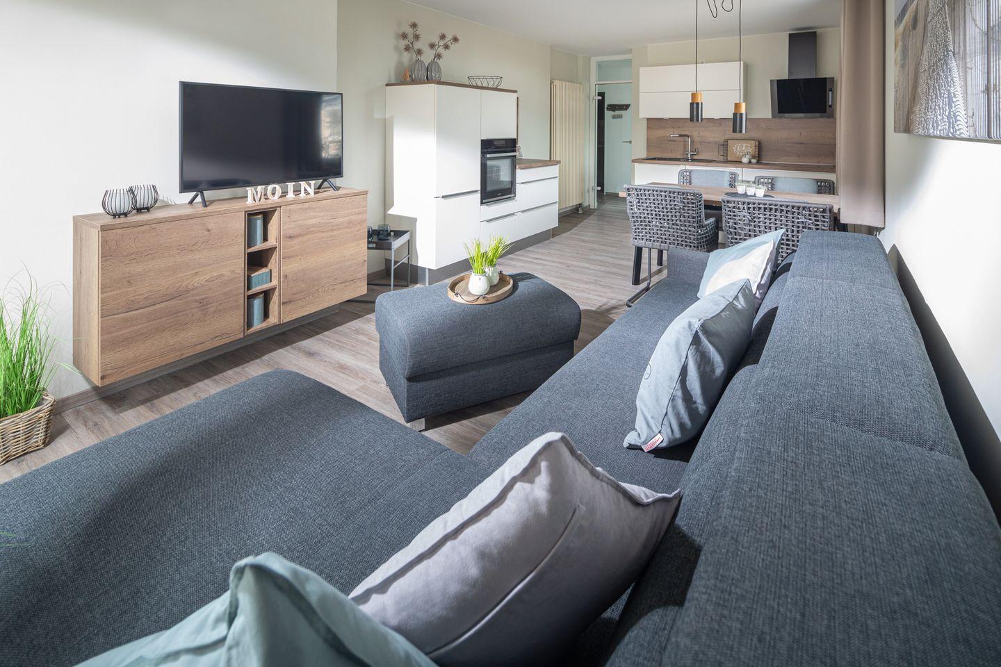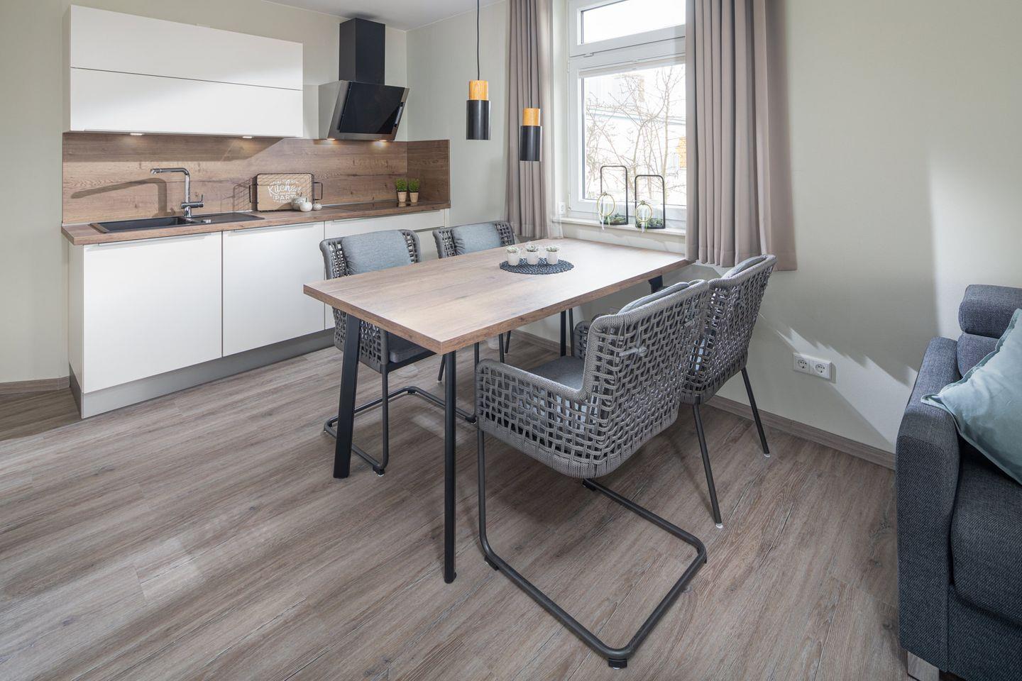 Die Wohnung verfügt über ein gemütliches Wohnzimmer mit einem Schlafsofa, das eine zusätzliche Schlafmöglichkeit bietet. Hier können Sie entspannte Abende verbringen und es sich bequem machen. Die voll ausgestattete Küche lässt keine Wünsche offen: Sie ist mit einem Backofen, einem Ceranfeld, einer Spülmaschine sowie einem Kühlschrank mit Gefrierfach ausgestattet, sodass Sie nach Herzenslust kochen können.