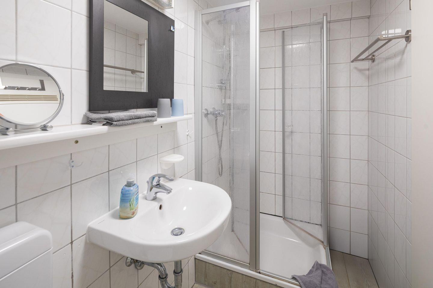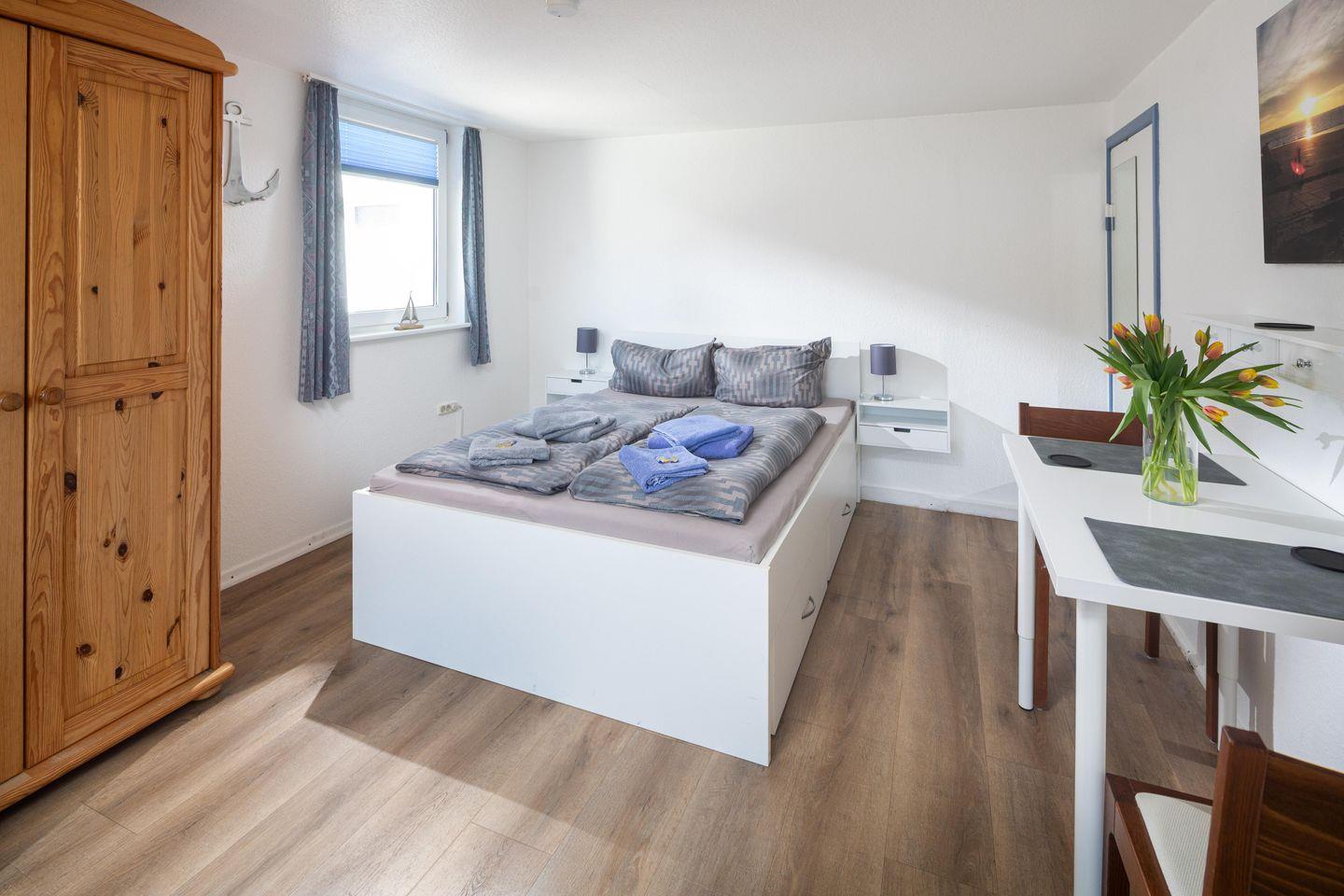 Die 1-Raum-Ferienwohnung im ersten Obergeschoss verfügt über einen Wohn-/Schlafraum mit Doppelbett (2x 70x200cm, erhöht, offenes Fußende), Kabel-TV, Essecke, separater Küche (4-Plattenherd, Backofen) und Bad mit Dusche/WC.