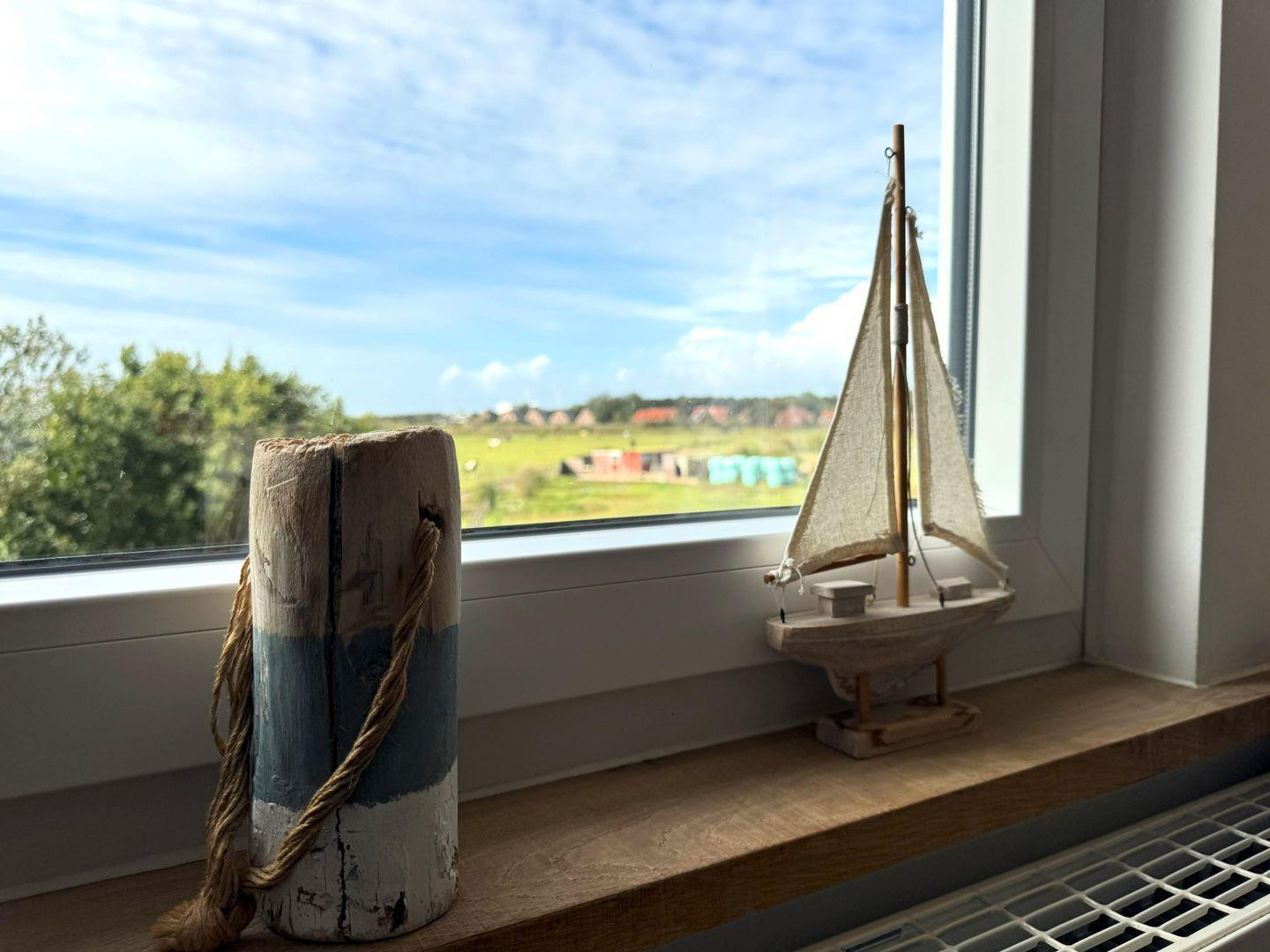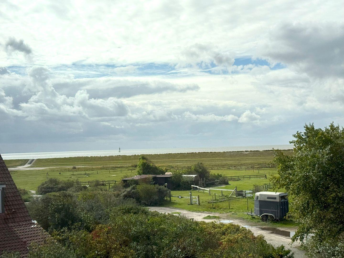 Vom Wohn-Schlafraum aus haben Sie einen weiten Blick über Wiese und Deich und können das bunte Treiben der Schiffe auf der Nordsee beobachten.