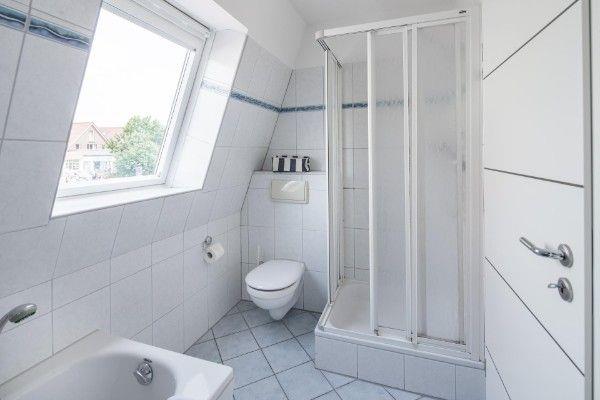 Im 1. OG befindet sich ein Schlafzimmer mit Doppelbett, Badezimmer mit Dusche/ WC und ein Balkon. Im 2. OG befindet sich ein weiteres Schlafzimmer mit zwei Einzelbetten und Gäste-WC.