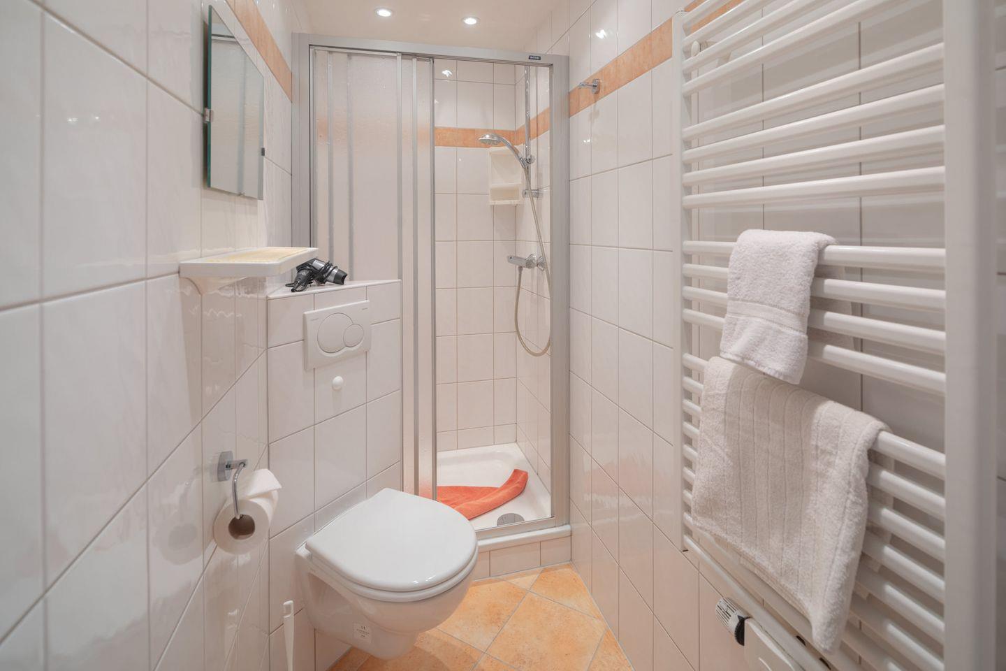Das Badezimmer ist mit einer Dusche ausgestattet – ideal für entspannende Momente nach einem Tag am Strand. Hier finden Sie auch einen Haartrockner. Im gesamten Apartment sorgt die Zentralheizung für angenehme Temperaturen, egal zu welcher Jahreszeit Sie zu Besuch sind.