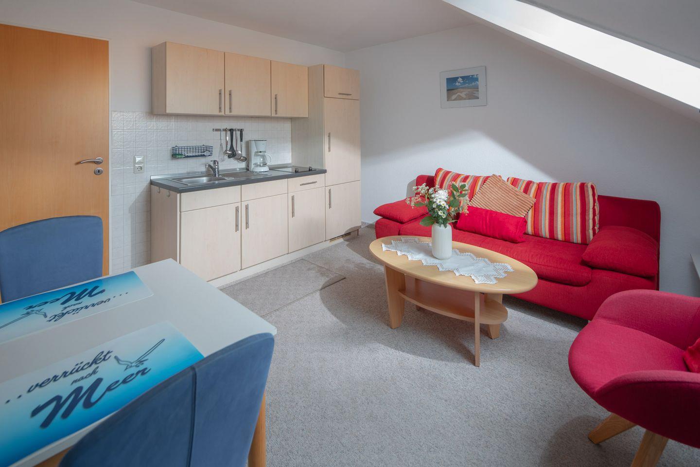 Die Ferienwohnung befindet sich im 2. Stock und besticht durch eine offene und einladende Raumgestaltung. Das Schlafzimmer ist mit bequemen Betten ausgestattet. Im Wohnzimmer finden Sie ein gemütliches Sofa, einen TV sowie einen Essbereich, an dem Sie die frisch zubereiteten Mahlzeiten genießen können. Die voll ausgestattete Küche verfügt über moderne Geräte, darunter ein Cerankochfeld, Kühlschrank, Kaffeemaschine, Toaster und Wasserkocher – perfekt, um Ihre Lieblingsgerichte zu kochen.