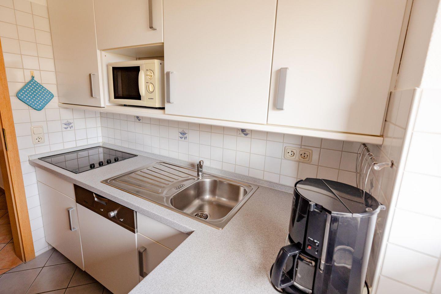 Die geschlossene Küche ist voll ausgestattet mit Herd, Geschirrspüler, Kühlschrank, Mikrowelle und allem, was du zum Kochen brauchst. Genieße dein Frühstück oder Abendessen im Essbereich oder auf dem Balkon und lass den Tag entspannt ausklingen.
