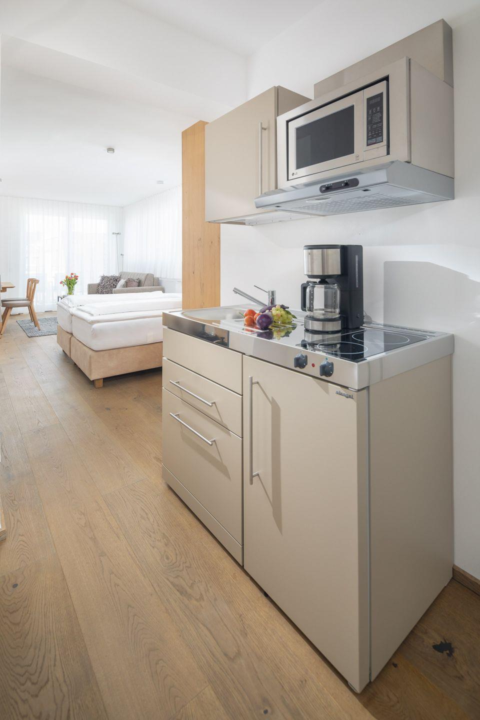 Die moderne Küchenzeile bietet alles, was man für kleine Gerichte oder das Frühstück auf der Terrasse benötigt: 2-Platten-Ceranfeld, Mikrowelle mit Grill, kleine Spülmaschine, Kaffeemaschine, Wasserkocher und Toaster – praktisch, platzsparend und funktional.
