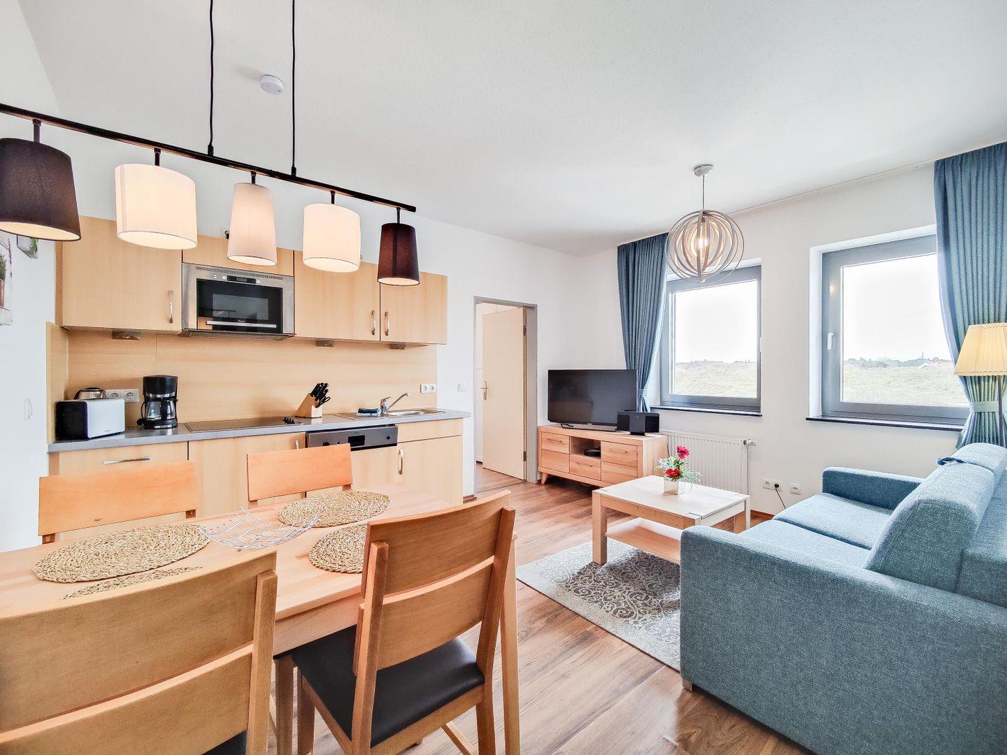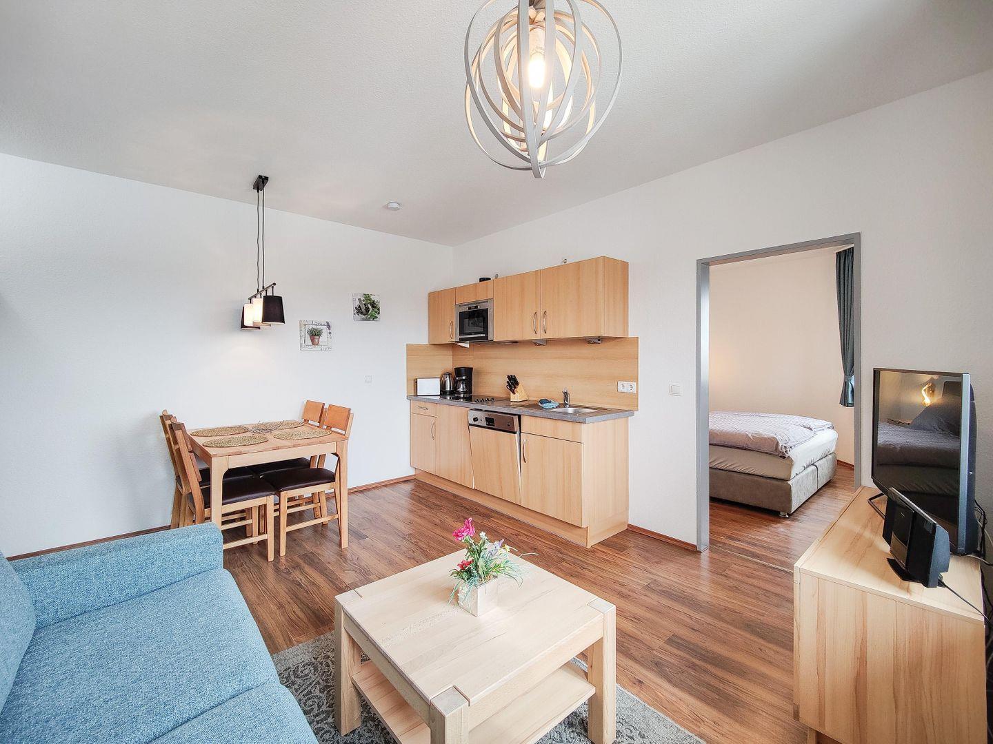Freu dich auf ein gemütliches Schlafzimmer, ein modernes Badezimmer mit Dusche und Wanne sowie ein offenes Wohn- und Esszimmer mit voll ausgestatteter Küche. Spülmaschine, Cerankochfeld, Kaffeemaschine – hier ist alles da, was du für einen entspannten Aufenthalt brauchst. Genieße deine Mahlzeiten am Esstisch oder mach es dir auf der Sofaecke bequem und schau deinen Lieblingsfilm. WLAN sorgt dafür, dass du immer verbunden bleibst.