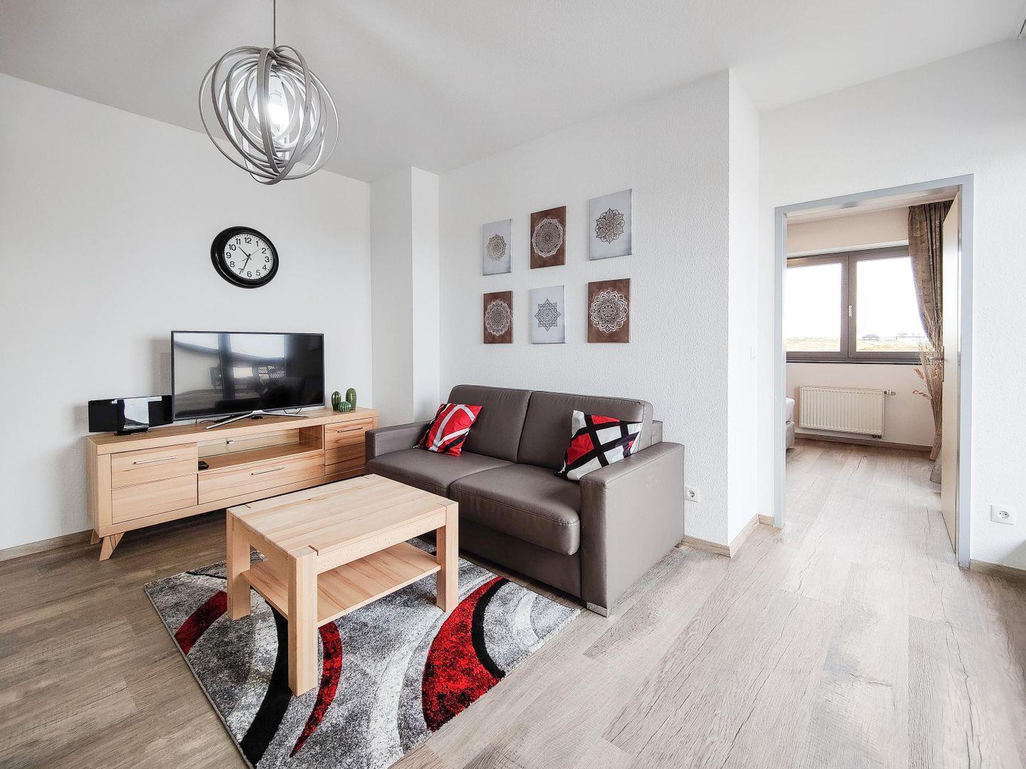 Freu dich auf ein helles Schlafzimmer mit komfortablem Bett und ein gemütliches Wohnzimmer mit offener Küche. Hier findest du alles, was du brauchst: Geschirr, Besteck, Kochutensilien, Mikrowelle, Herd, Kühlschrank und eine Spülmaschine, die das Aufräumen erleichtert. Am Esstisch kannst du gemeinsame Mahlzeiten genießen, und auf dem Sofa entspannen, während du WLAN nutzt oder einen Film auf dem großen TV schaust.