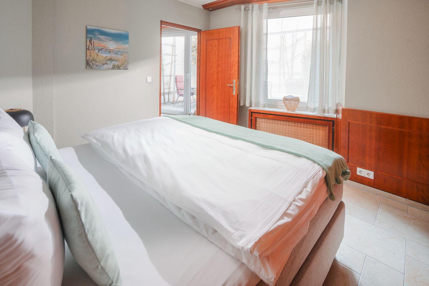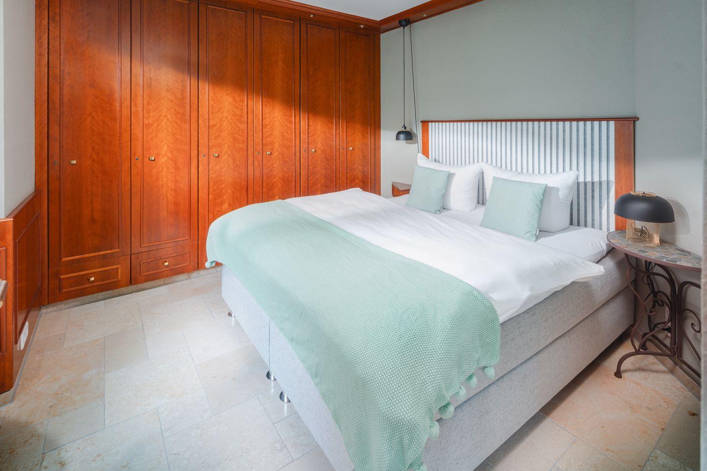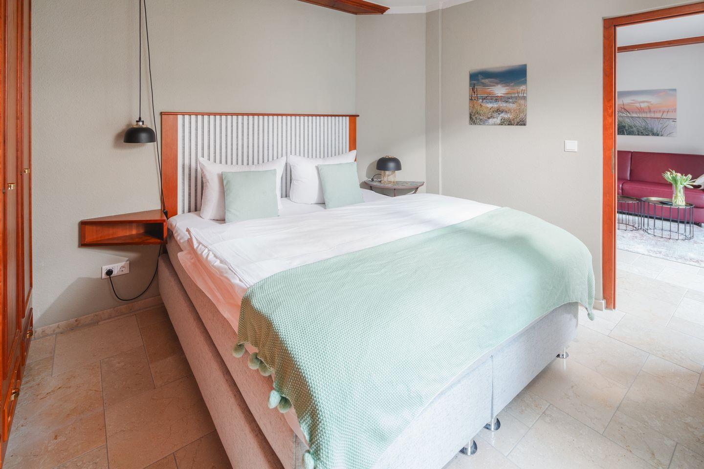 Das Schlafzimmer ist ruhig, schlicht und sehr gemütlich. Das große Boxspringbett sorgt für herrlich erholsamen Schlaf, während sich im Schrank genug Platz für Kleidung und kleine Urlaubsschätze findet – Muscheln, Bücher, Mitbringsel vom Inselbummel.