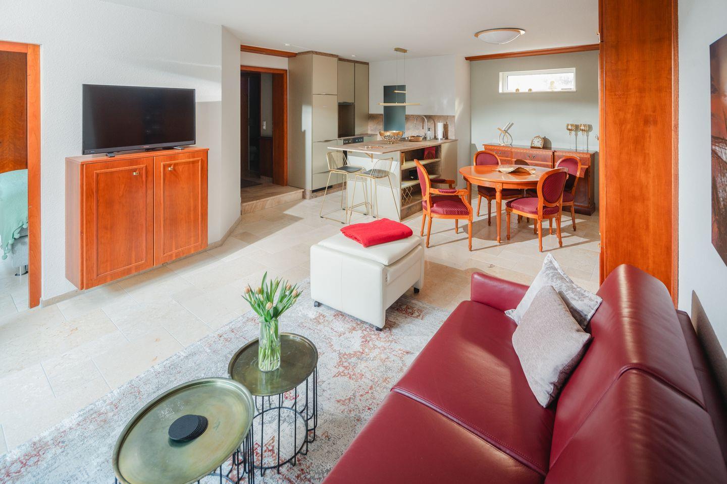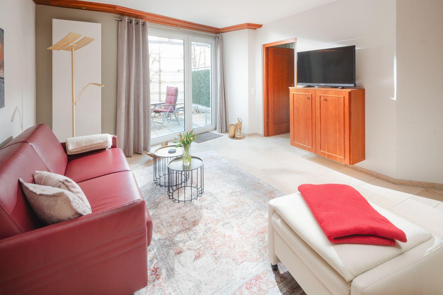 Ein gemütliches Sofa, ein Teppich in hellen Sandfarben, ein Fernseher für die ruhigen Abende – alles wirkt harmonisch und aufeinander abgestimmt.
