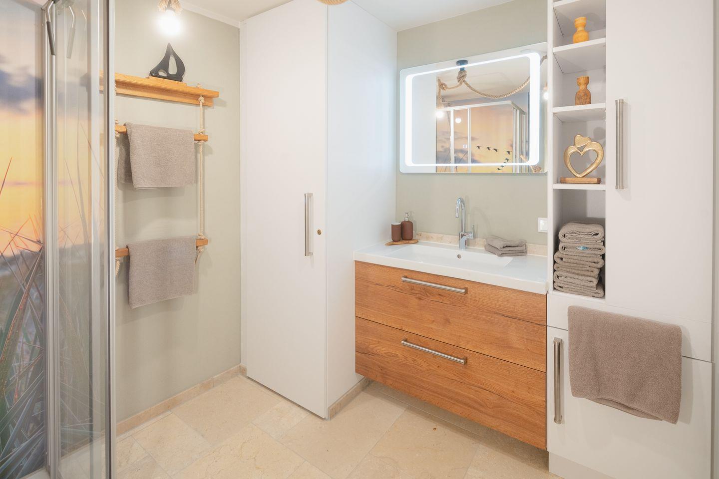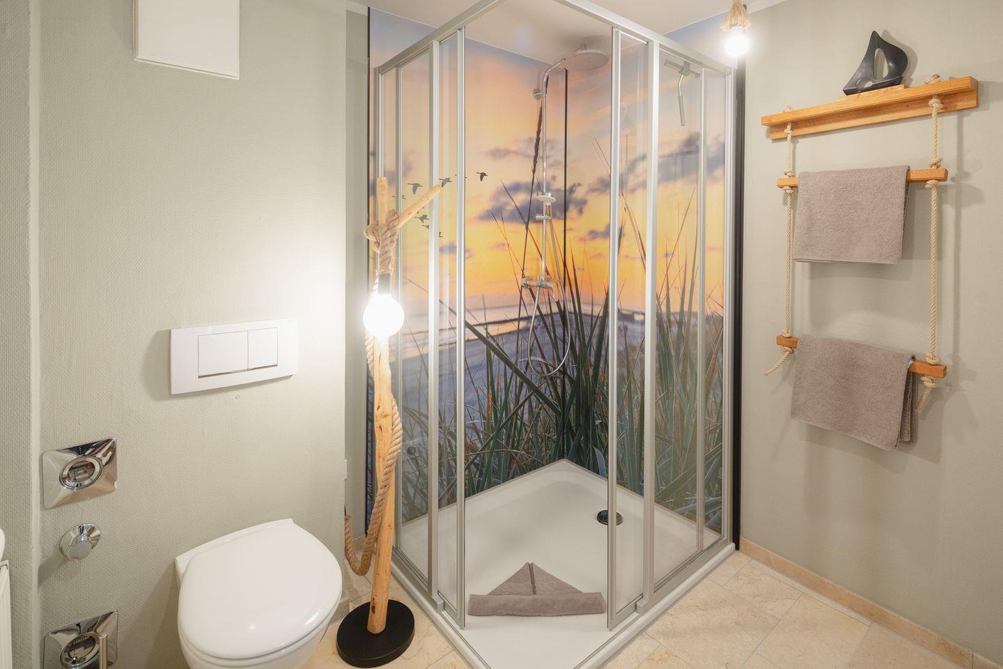 Eine bodengleiche Dusche, Handtücher, Spiegel, Föhn – alles, was man braucht, ist da. Nach einem Strandtag ist das warme Wasser eine Wohltat, und der Duft von frischer Luft bleibt noch auf der Haut, wenn man zurück ins Wohnzimmer geht.