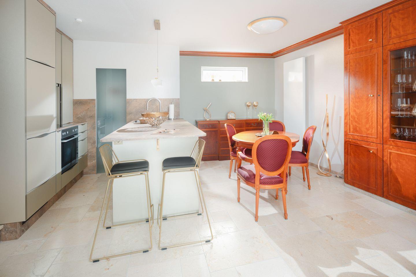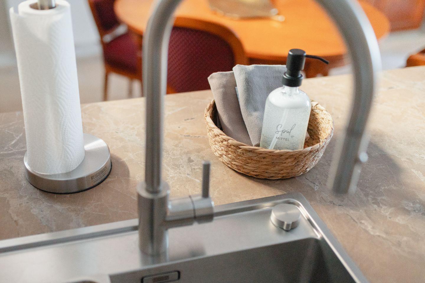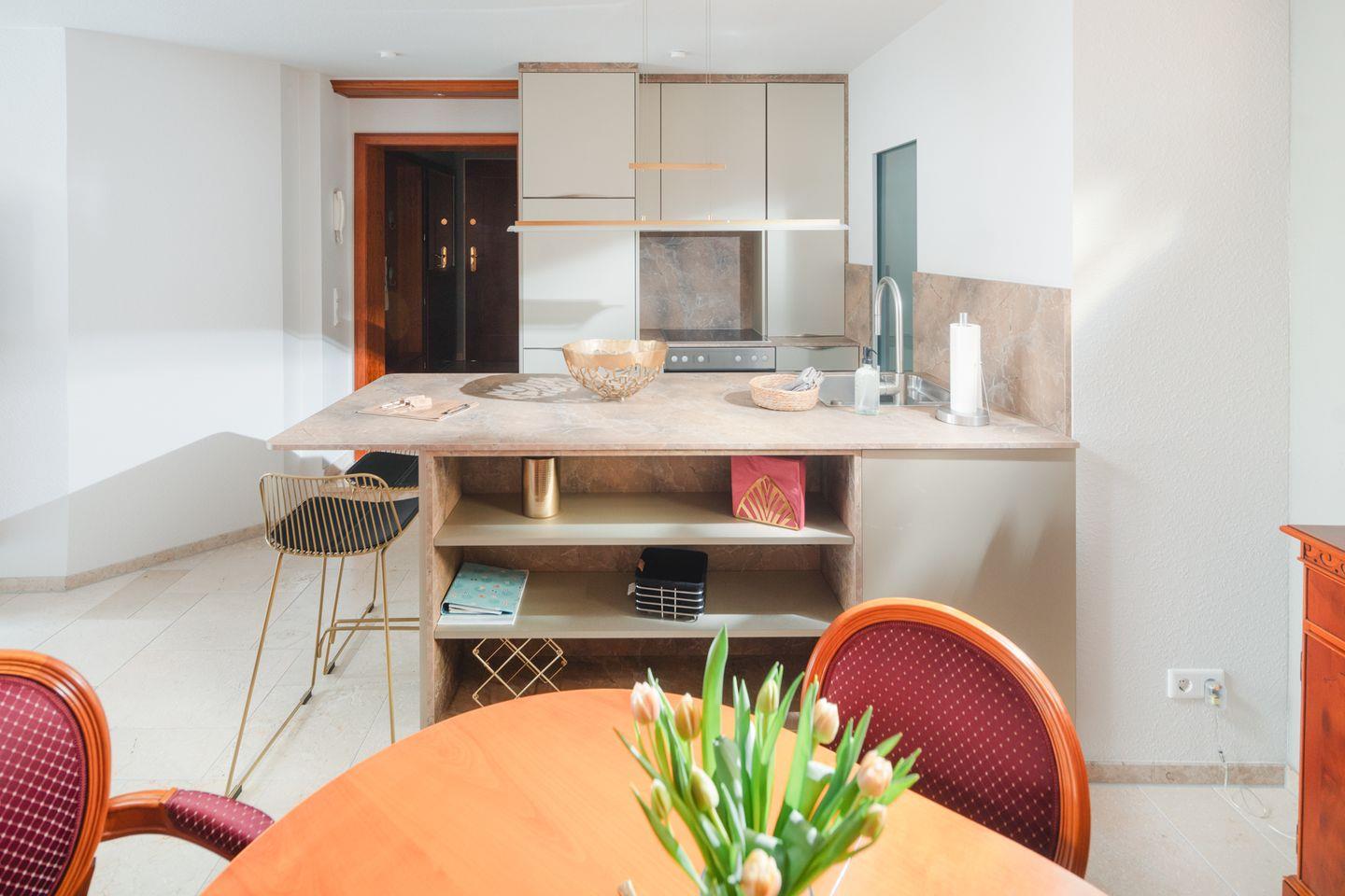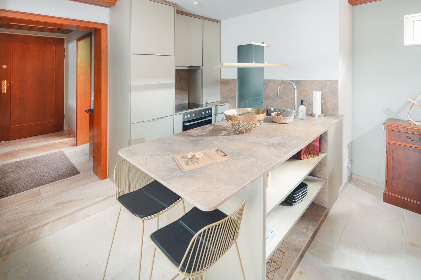 Die offene Küche ist modern und gut ausgestattet – genau richtig, um sich im Urlaub selbst zu versorgen, ohne auf Komfort zu verzichten.