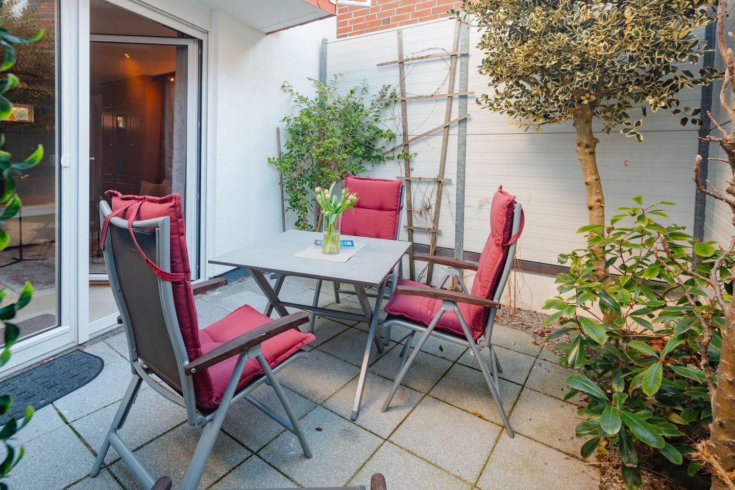 Die Terrasse ist nach Westen ausgerichtet, geschützt und wunderbar sonnig.
