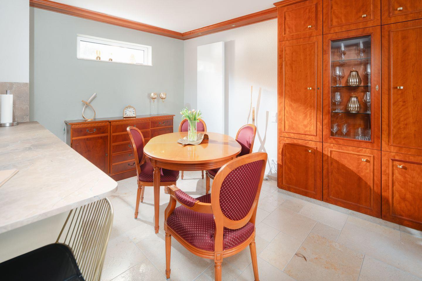 Hier kann man entspannt frühstücken, gemeinsam kochen oder abends bei einem Glas Wein zusammensitzen. Der Esstisch aus hellem Holz steht direkt am Fenster – mit Blick auf die Terrasse, wo später die Sonne untergeht.