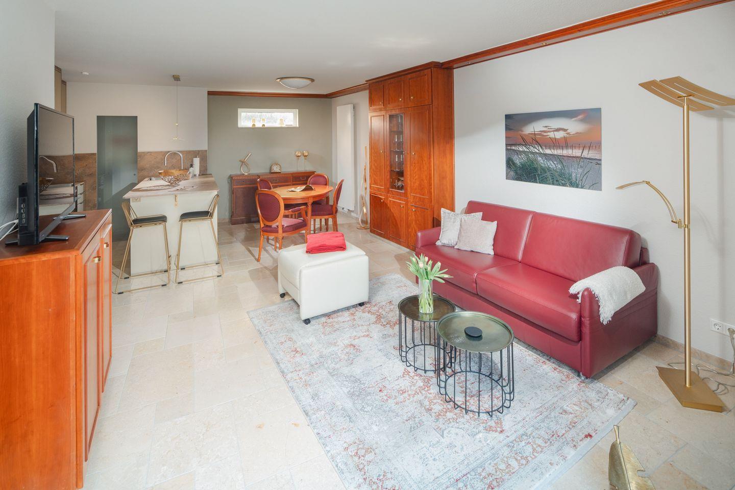 Das Schlafzimmer mit seinem Boxspringbett (180×200 cm) lädt zum Ausschlafen ein, während im Wohnzimmer ein bequemes Schlafsofa (160×200 cm) zusätzlichen Platz bietet. Draußen weht schon die Nordseeluft, und wenn man das Fenster öffnet, hört man manchmal das ferne Rauschen der Wellen.