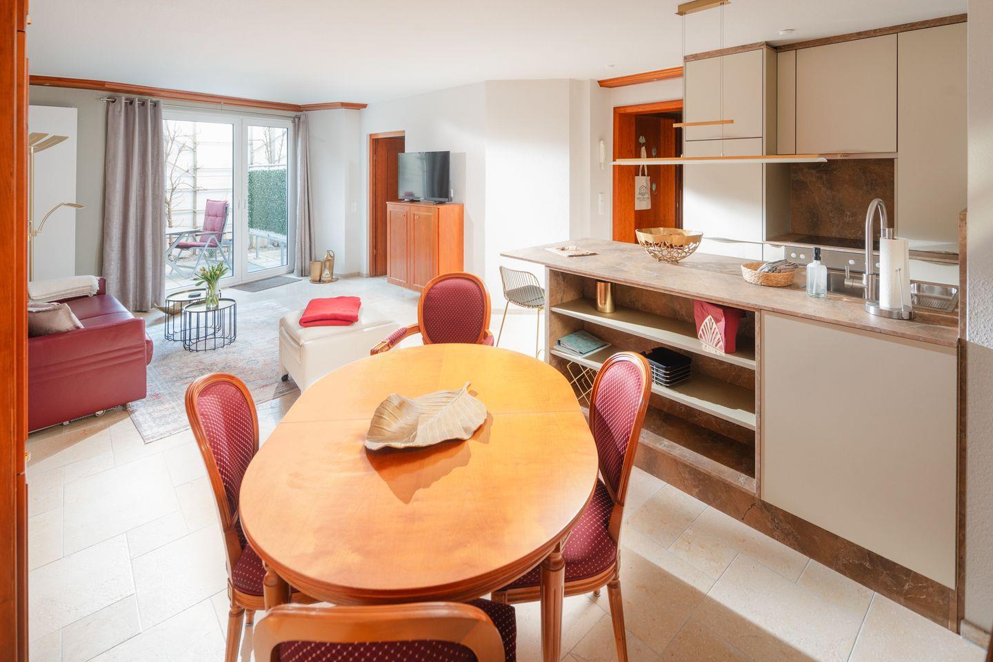 Im Erdgeschoss gelegen, frisch renoviert im Jahr 2024, bietet sie auf 59 Quadratmetern Platz für bis zu 3 Personen. Zwei Zimmer, eine offene Küche, ein modernes Duschbad und eine sonnige Terrasse – alles, was man braucht, um sich vom ersten Tag an zuhause zu fühlen.
