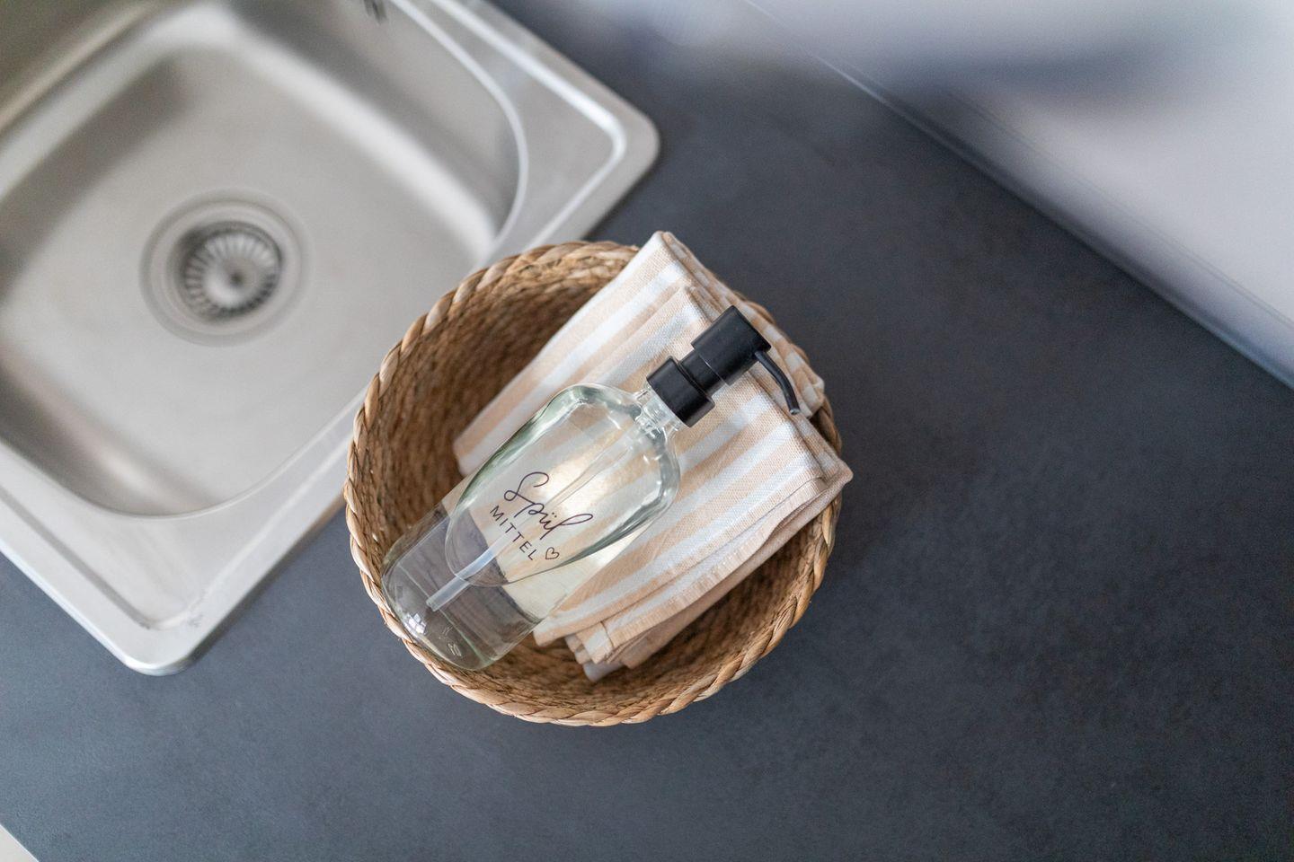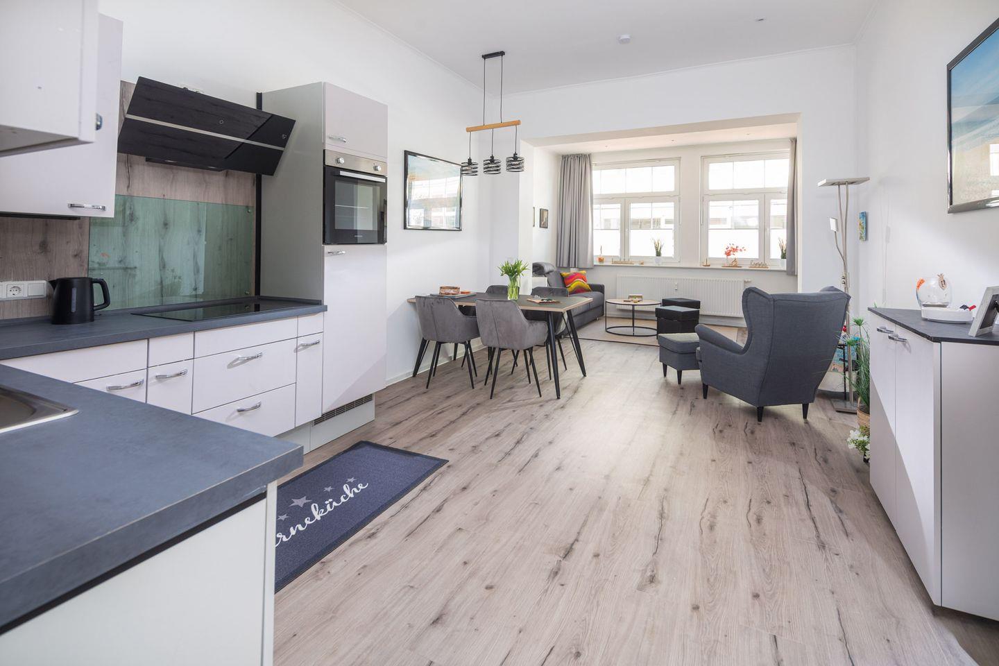 Die offene Küche ist komplett ausgestattet und bietet alles, was Sie für die Selbstverpflegung benötigen: Ein Cerankochfeld, ein Backofen, Kühlschrank mit Gefrierfach, Geschirrspüler, Kaffeemaschine, Wasserkocher und Toaster stehen bereit – perfekt für ein gemütliches Frühstück oder ein selbstgekochtes Abendessen nach einem Tag am Meer.