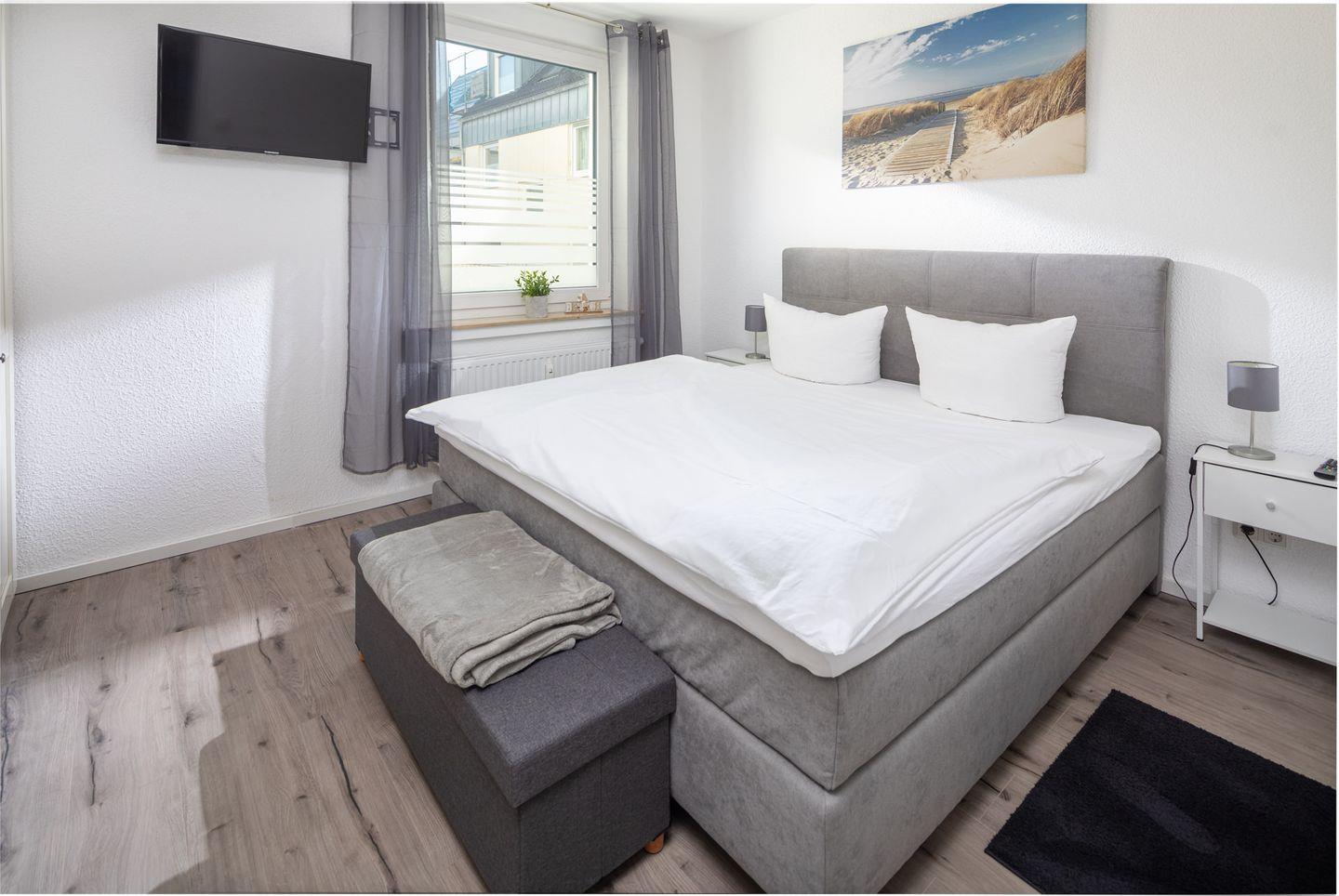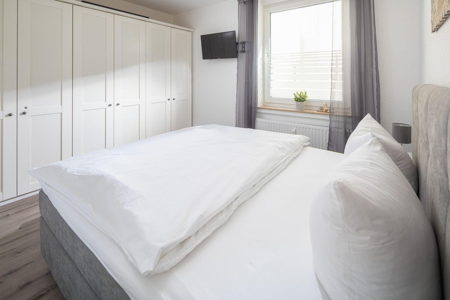 Das separate Schlafzimmer ist mit einem großzügigen Doppelbett (180 × 200 cm) ausgestattet und verspricht erholsame Nächte. Ein geräumiger Kleiderschrank bietet ausreichend Stauraum für Ihre Urlaubsgarderobe. Im Wohnbereich lädt ein komfortables Schlafsofa (Liegefläche ca. 160 × 200 cm) zum Entspannen ein – tagsüber als Kuschelecke, nachts als zusätzliche Schlafgelegenheit für zwei Personen.