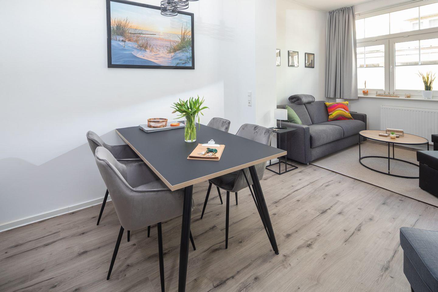 Diese liebevoll eingerichtete Ferienwohnung auf Norderney ist der perfekte Ort für alle, die dem Alltag entfliehen und die Nordsee in vollen Zügen genießen möchten. Mit einer Wohnfläche von ca. 54 m² bietet die Wohnung Platz für bis zu vier Personen und vereint modernes Design mit gemütlichem Wohlfühlambiente.
