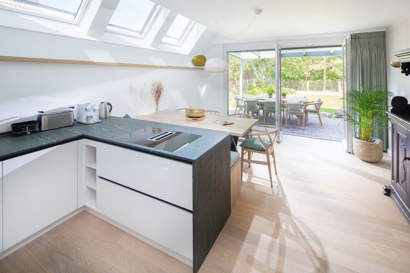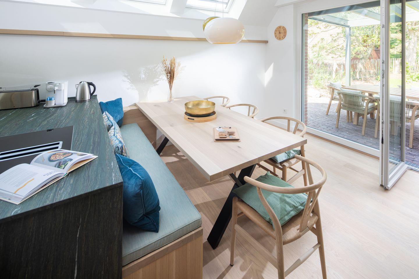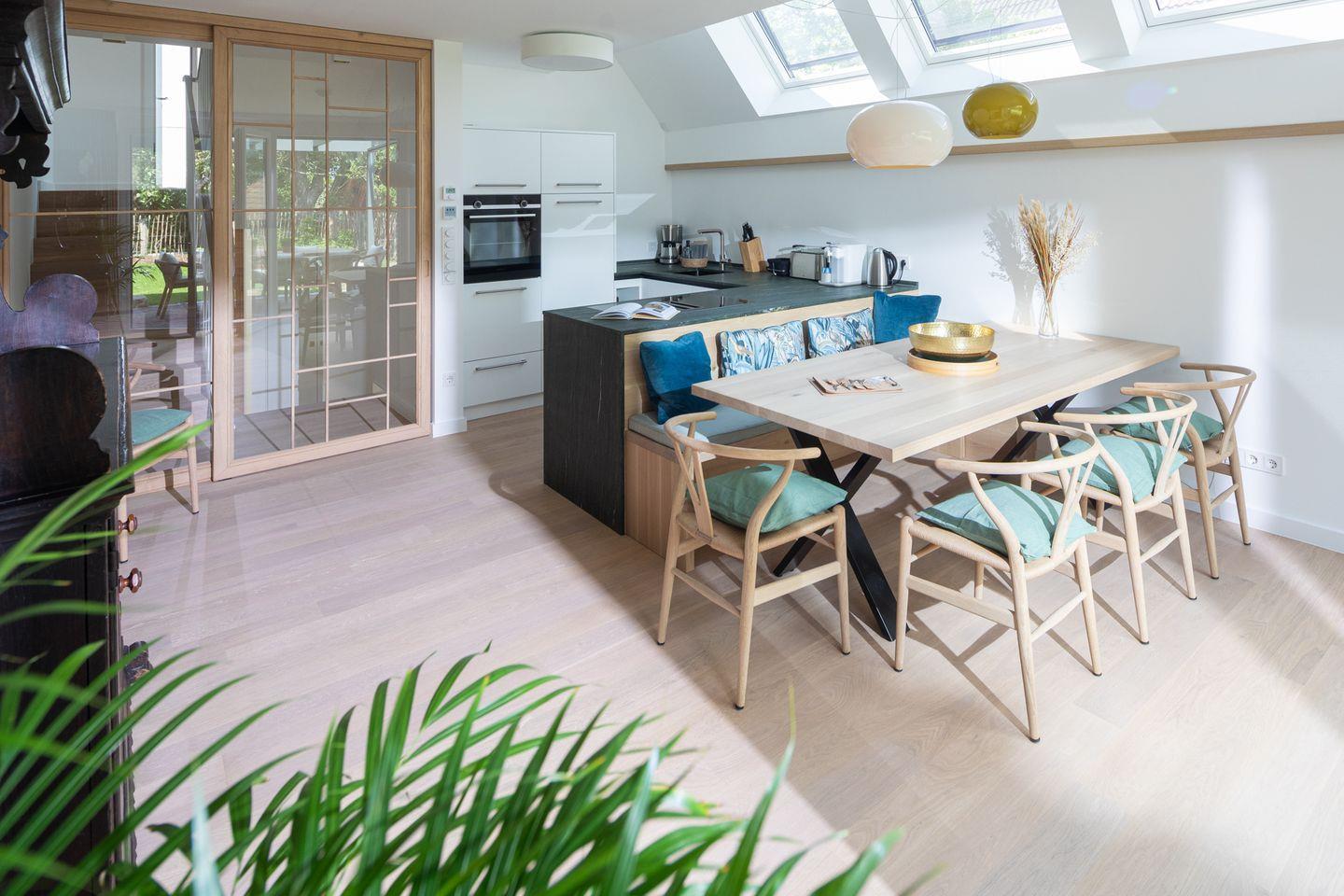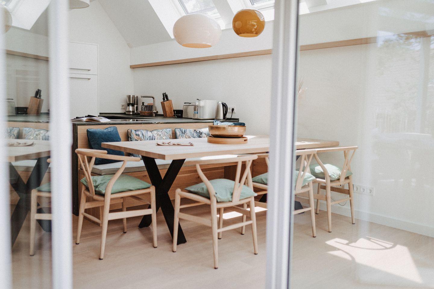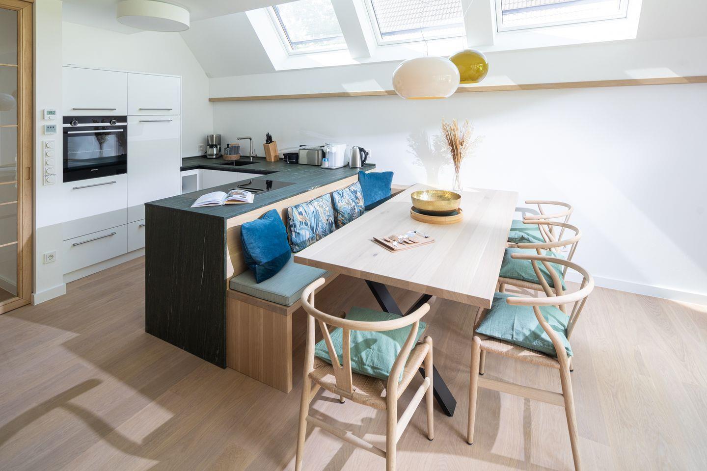 Die moderne Küche ist komplett ausgestattet und bietet alles, was Hobbyköche oder Kaffeeliebhaber sich wünschen: Induktionskochfeld, Geschirrspüler, Backofen, hochwertige Ausstattung, jede Menge Stauraum – und das Beste: ein großzügiger Essbereich mit Platz für alle. Hier wird gemeinsam gekocht, gegessen, gelacht. Der direkte Zugang zur überdachten Terrasse mit Markise macht den Übergang zwischen drinnen und draußen ganz leicht.