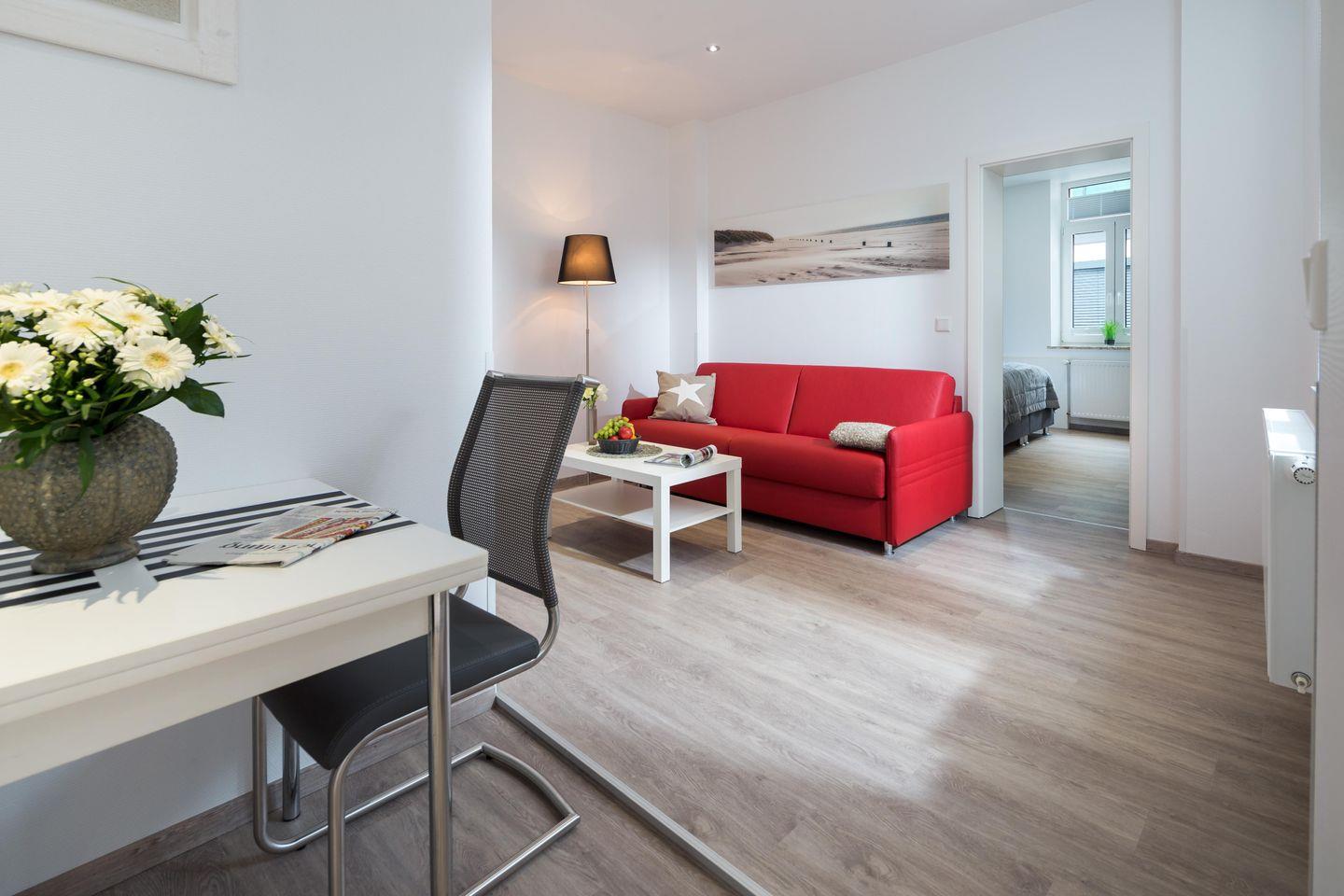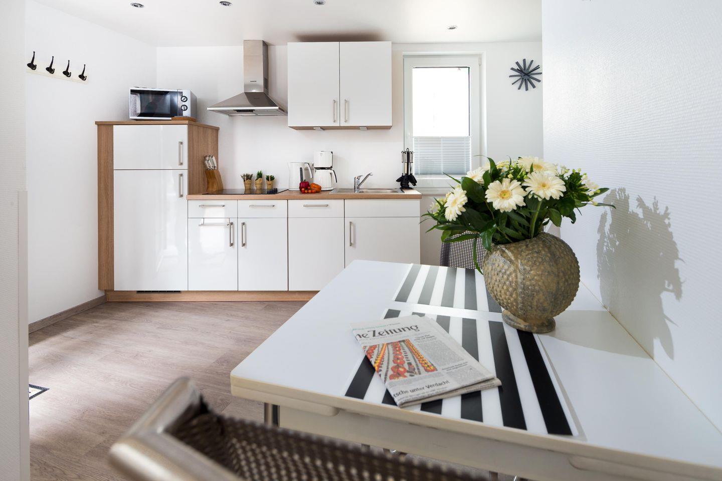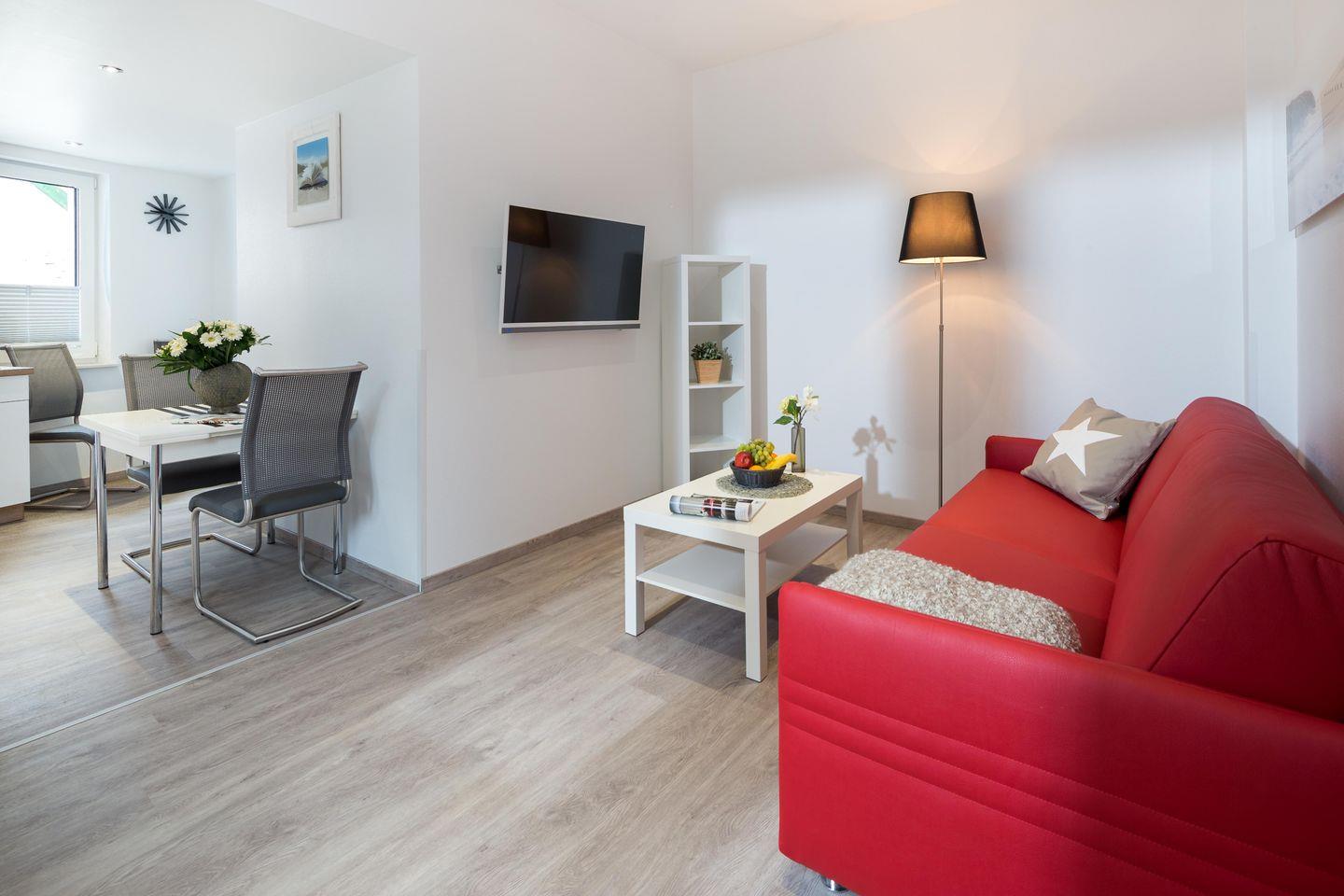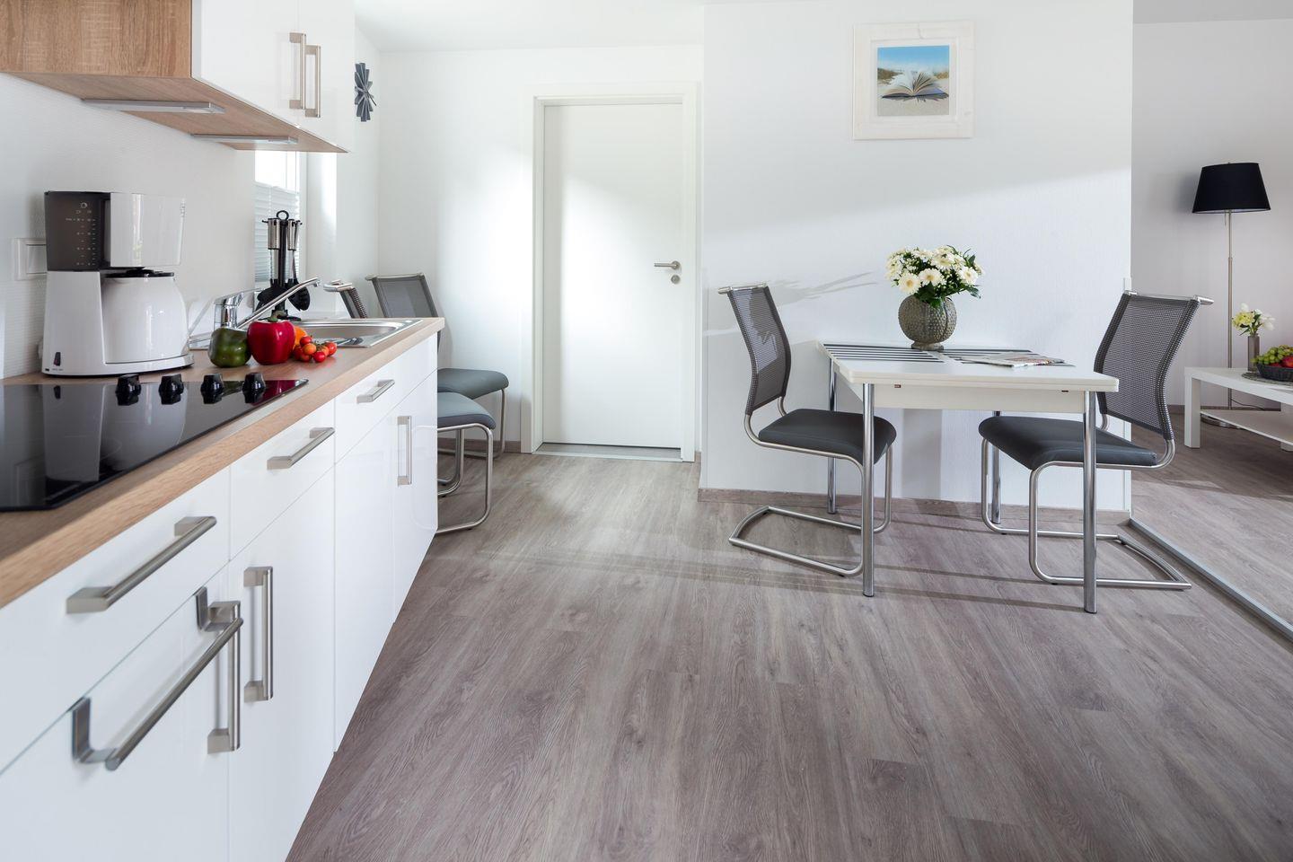 Der helle Wohnraum mit offener Küche ist der perfekte Ort zum Ankommen und Abschalten. Ob auf dem gemütlichen Federkern-Schlafsofa bei einem guten Buch oder gemeinsam beim Kochen – hier fühlt sich Urlaub sofort wie Zuhause an. Die vollausgestattete Küche mit Geschirrspüler, Mikrowelle, 4-Platten-Herd und Kaffeemaschine lässt euch auch kulinarisch unabhängig bleiben.