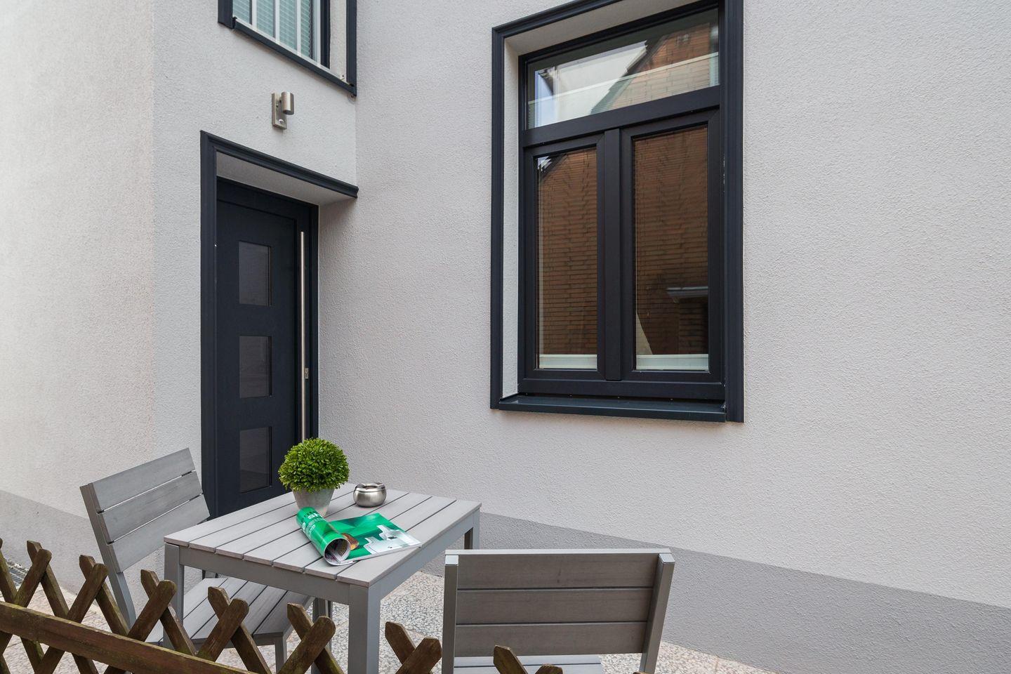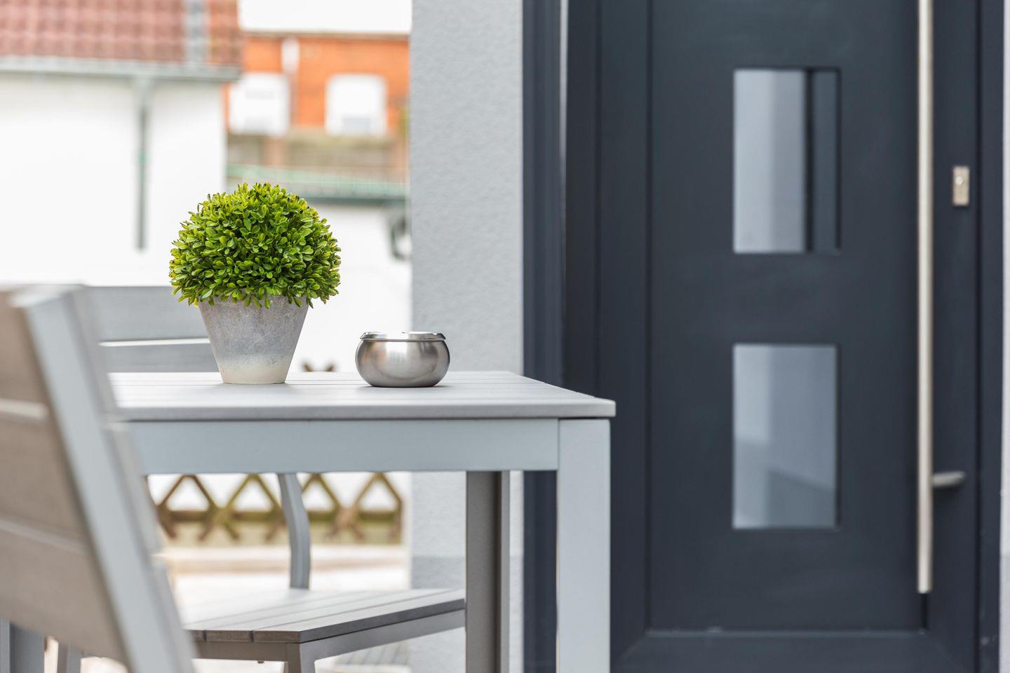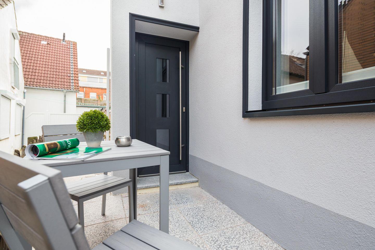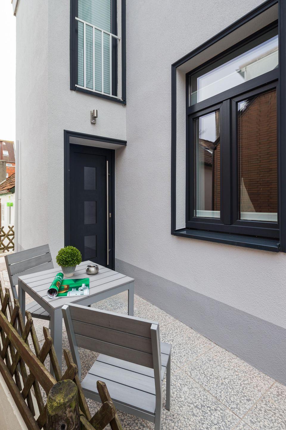 Draußen erwartet euch eine kleine, möblierte Terrasse – euer persönliches Plätzchen an der Inselsonne. Dazu zwei Flachbildfernseher, kostenloses WLAN mit Passwort und im Hausflur Waschmaschine, Trockner sowie Bügelset zur gemeinschaftlichen Nutzung.
