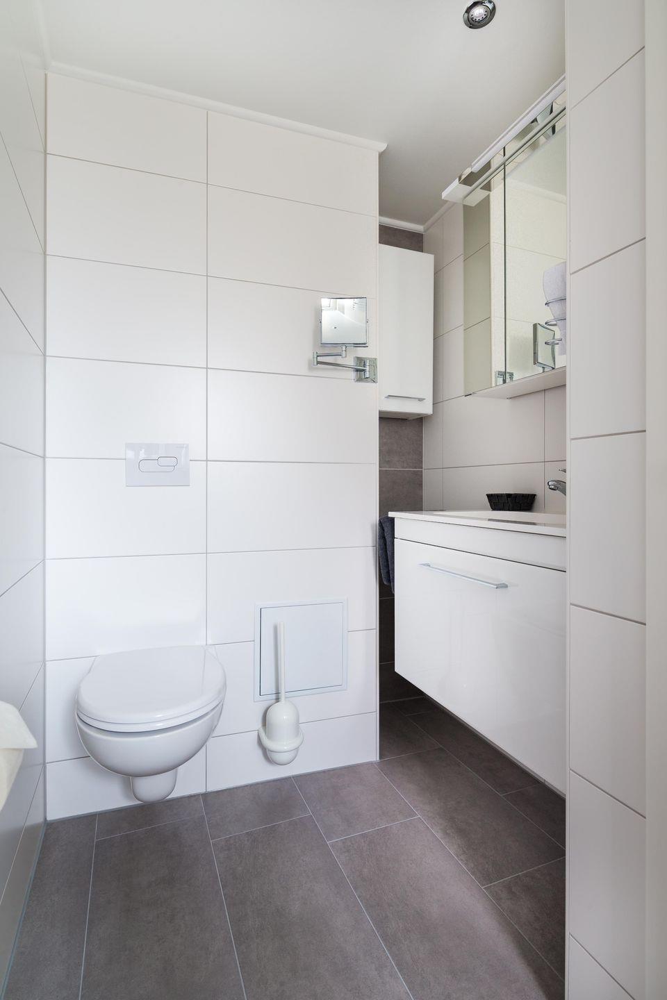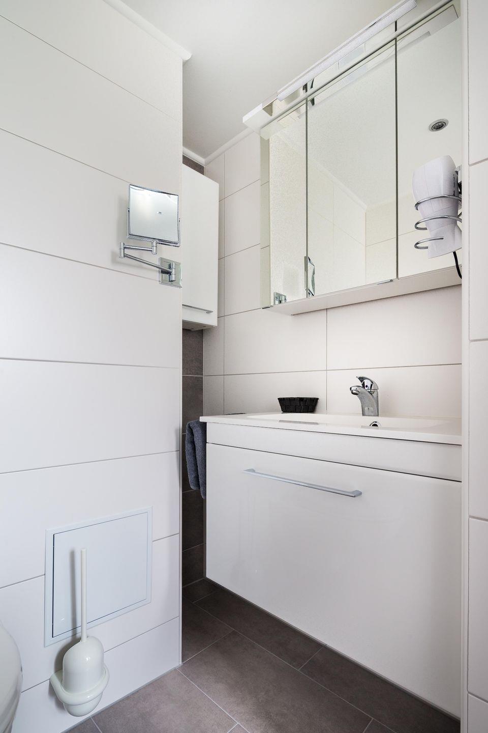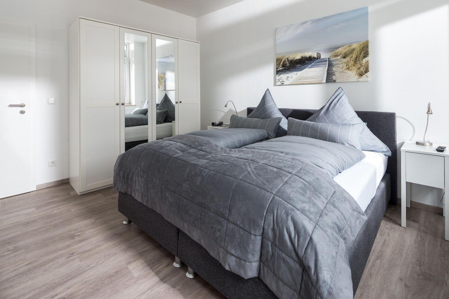 Im separaten Schlafzimmer wartet ein hochwertiges Boxspringbett auf euch – für tiefe Erholung nach langen Strandspaziergängen. Das moderne Bad mit Fenster, ebenerdiger Duschwanne, großzügigem Waschtisch und Vergrößerungsspiegel macht den Start in den Tag besonders angenehm. Ein Föhn ist natürlich vorhanden.