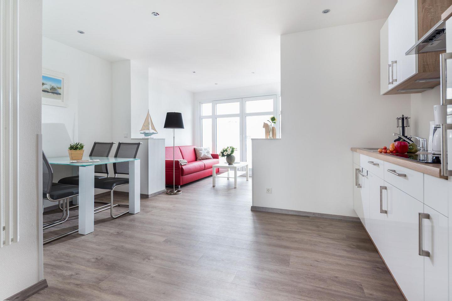 Fazit: Wohnung 6 vereint modernen Komfort mit hellen Räumen und kluger Ausstattung. Ideal für Paare, Familien oder Freund:innen, die gern etwas mehr Raum genießen möchten – mitten in Norderneys Zentrum, aber im eigenen Rückzugsbereich voll zur Ruhe kommen.