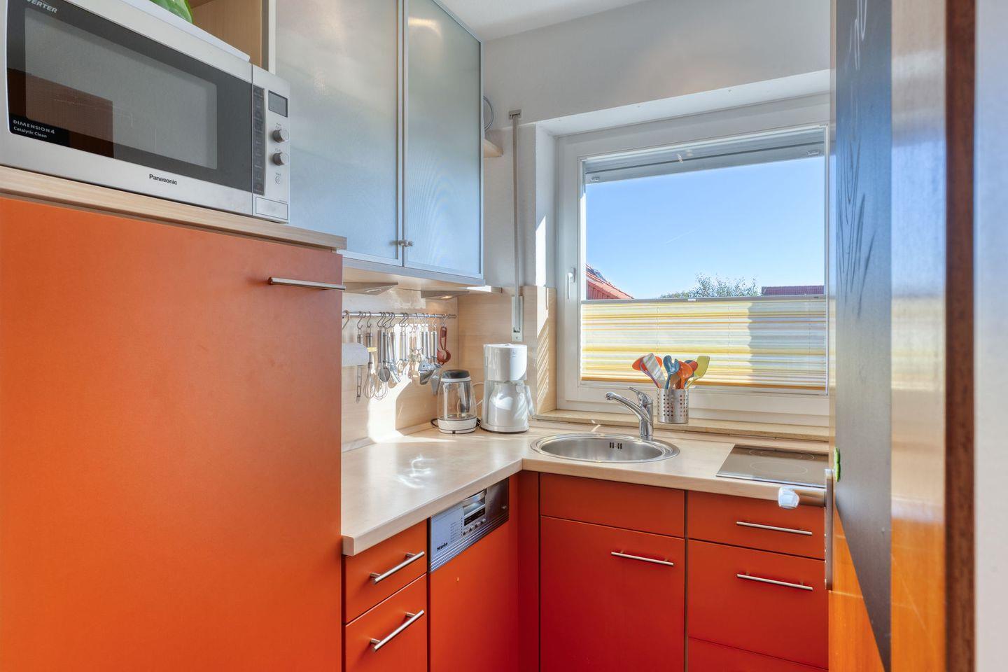 Im geschlossenen Küchenbereich erwartet Sie eine umfassende Ausstattung, die alle notwendigen Geräte für die Selbstversorgung bereithält: Cerankochfeld, Mikrowelle (mit Heißluft- und Grillfunktion), Geschirrspüler, Kühlschrank, Kaffeemaschine, Wasserkocher, Toaster sowie Eierkocher. Auch ausreichend Küchenutensilien, Geschirr und Besteck sind vorhanden. Für gemütliche Mahlzeiten steht Ihnen ein Essbereich mit Esstisch zur Verfügung.
