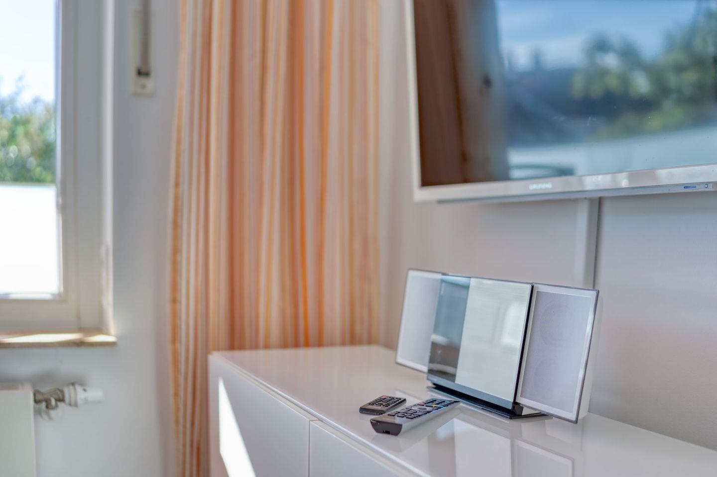 Das Wohnzimmer ist mit einem Kabel-TV (35 Zoll), Radio und DVD-Spieler ausgestattet und lädt zu entspannten Abenden ein. WLAN ist selbstverständlich verfügbar. Bücher bieten zusätzliche Unterhaltung.