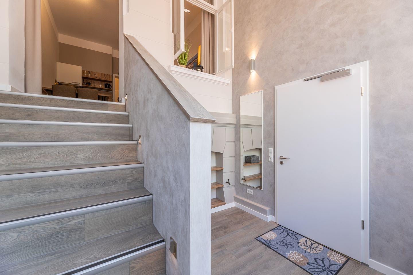 Kajüte 7 im Ferienhaus Inselanker erstrahlt im modernen maritimen Stil – hell, freundlich und gemütlich, mit viel Flair durch die hohe Verandaraumgestaltung. Auf 45 m² erstreckt sich die Wohnung über Erdgeschoss und 1. Etage und bietet Platz für bis zu 4 Personen, auch mit Hund. Im Wohnbereich laden Sofa (als Schlafsofa 170×190?cm) und Cocktailsessel zum Entspannen ein, die voll ausgestattete Küche mit Essplatz sorgt für gemeinsame Mahlzeiten. Im separaten Schlafzimmer stehen ein Doppelbett und ein großer Kleiderschrank bereit. Das Bad mit Dusche und WC ist modern eingerichtet, zwei TV-Flachbildschirme runden den Komfort ab. Ideal für Familien, Freunde oder Hundebesitzer, die das typische Norderneyer Urlaubsgefühl genießen möchten.