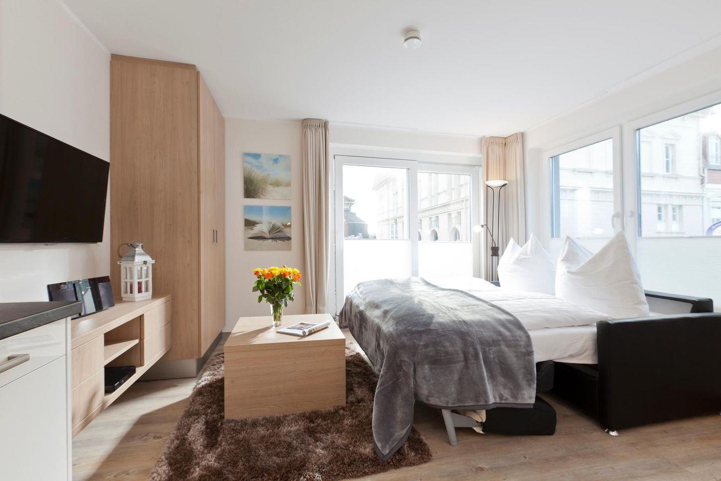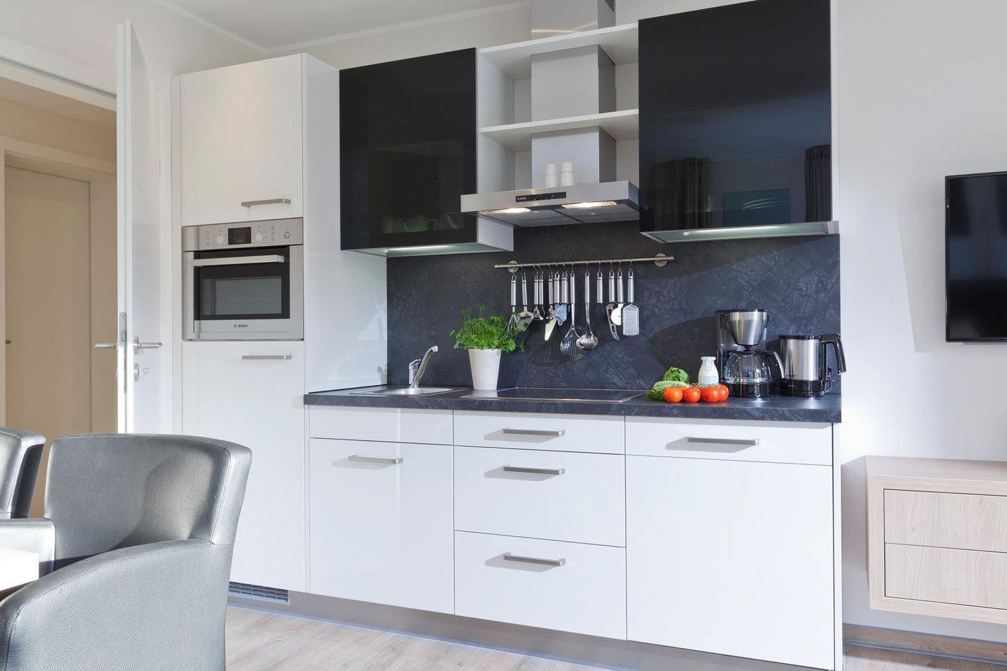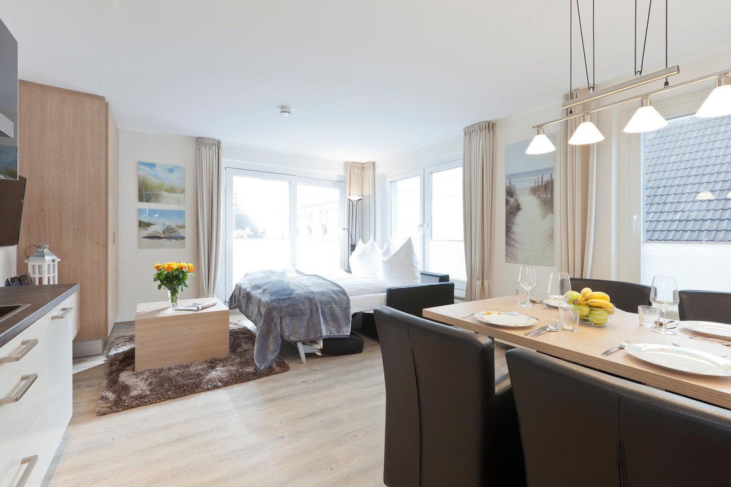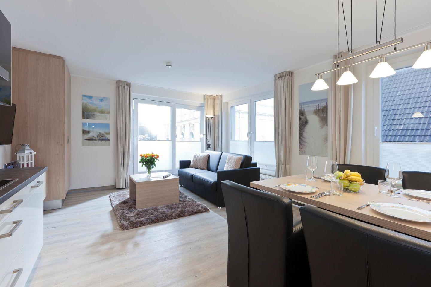 Die Wohnung verfügt über ein Schlafzimmer mit einem Doppelbett. Das Wohnzimmer bietet eine Schlafcouch, die Platz für bis zu zwei weitere Personen bietet. Damit eignet sich die Wohnung ideal für Familien oder kleine Gruppen. Die Küchenzeile ist gut ausgestattet. Das Badezimmer mit Dusche und WC ist modern gestaltet. Ein Highlight der Wohnung ist der 7 Quadratmeter große Balkon. Waschmaschine und Wäschetrockner befinden sich im Haus und stehen (für die gemeinschaftliche Nutzung gegen Münzeinwurf) zur Verfügung, was besonders für längere Aufenthalte von Vorteil ist. Hunde sind in dieser Ferienwohnung nicht erlaubt.